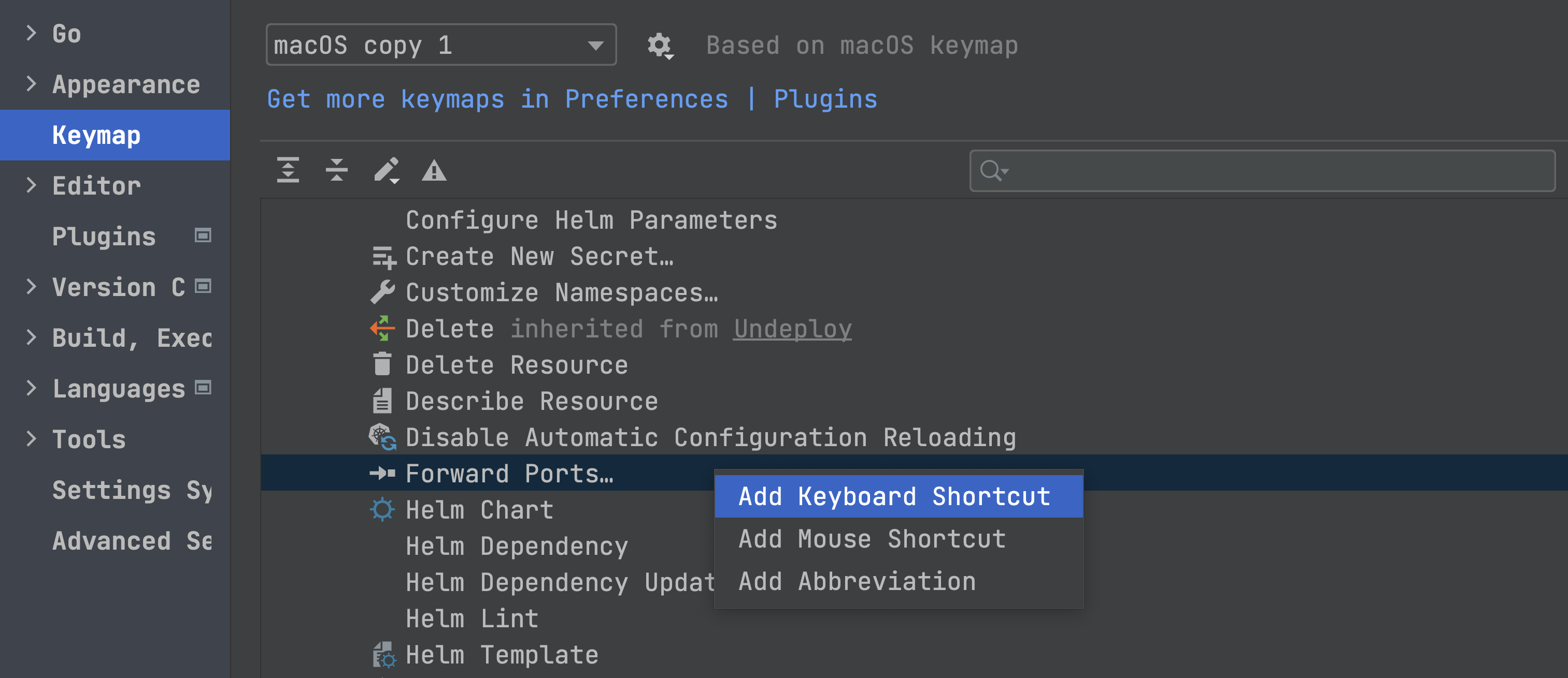 您现在可以在 Services(服务)视图中为大多数 Kubernetes 操作指定快捷键,例如 Forward Ports(转发端口)、 Delete Resource(删除资源)和 Describe Resource(描述资源)等。 转到 Settings | Keymap | Plugins | Kubernetes(设置 | 按键映射 | 插件 | Kubernetes)即可设置自定义快捷键。