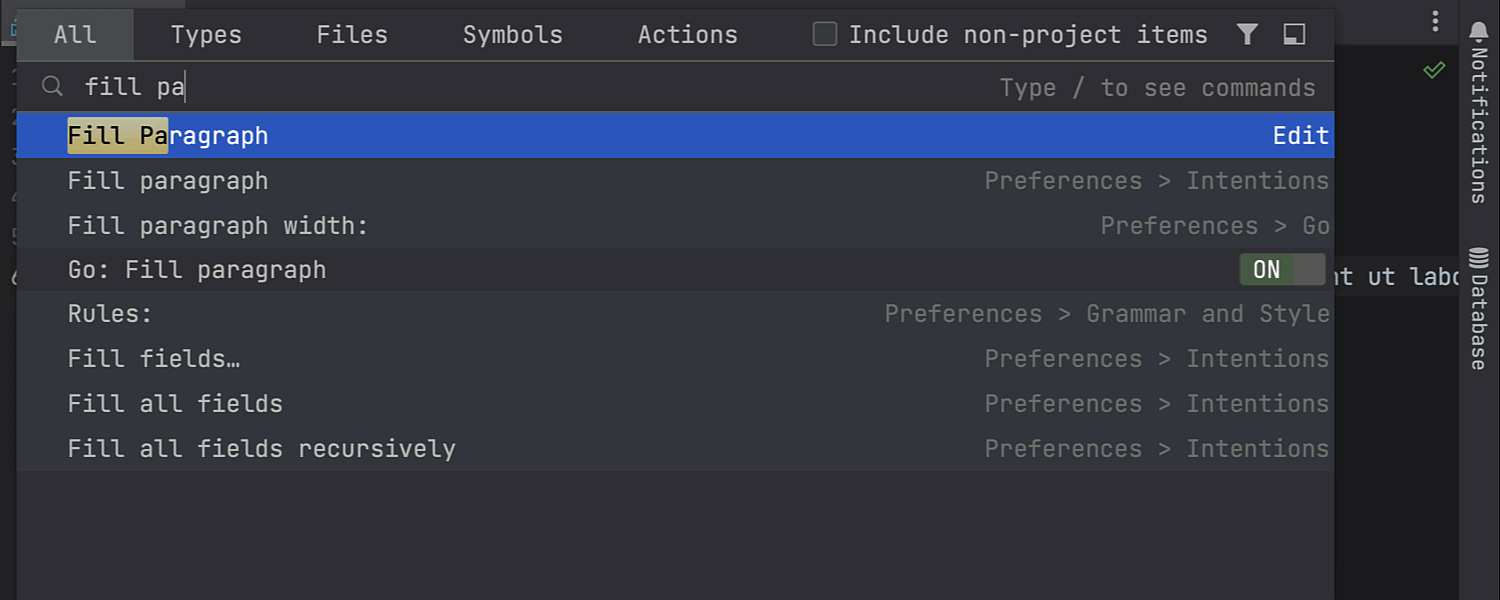 Markdown 文件现在支持 Fill Paragraph(填充段落)编辑器操作,您可以将长文本分成几个长度相等的行。 将文本光标置于要编辑的段落内,然后从 Edit(编辑)菜单调用操作或使用 Search everywhere(随处搜索)(按两次 Shift)搜索 Fill Paragraph(填充段落)命令并执行。