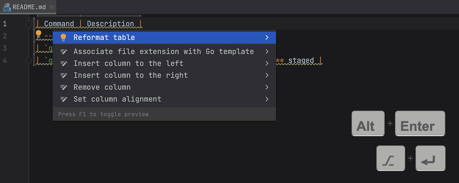 一项新意图操作可用于更正 Markdown 文件中表的格式设置。 您可以通过快捷键 Alt+Enter 或点击黄色灯泡图标并从出现的列表中选择 Reformat table(重新格式化表)来使用快速修复。