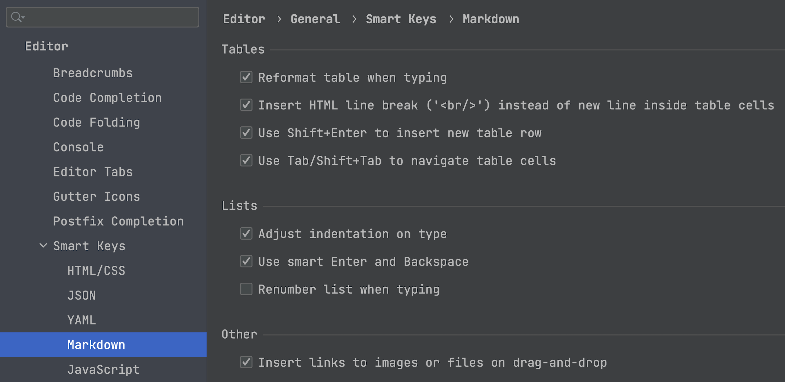我们在 Settings | Editor | General | Smart Keys(设置 | 编辑器 | 常规 | 智能按键)中添加了一个专属页面,用于配置和编辑 Markdown 偏好设置。 这个页面简化了偏好设置管理,为不同编辑器功能提供单独的复选框,取代了以前 Settings | Languages & Frameworks(设置 | 语言和框架)中的单个复选框。