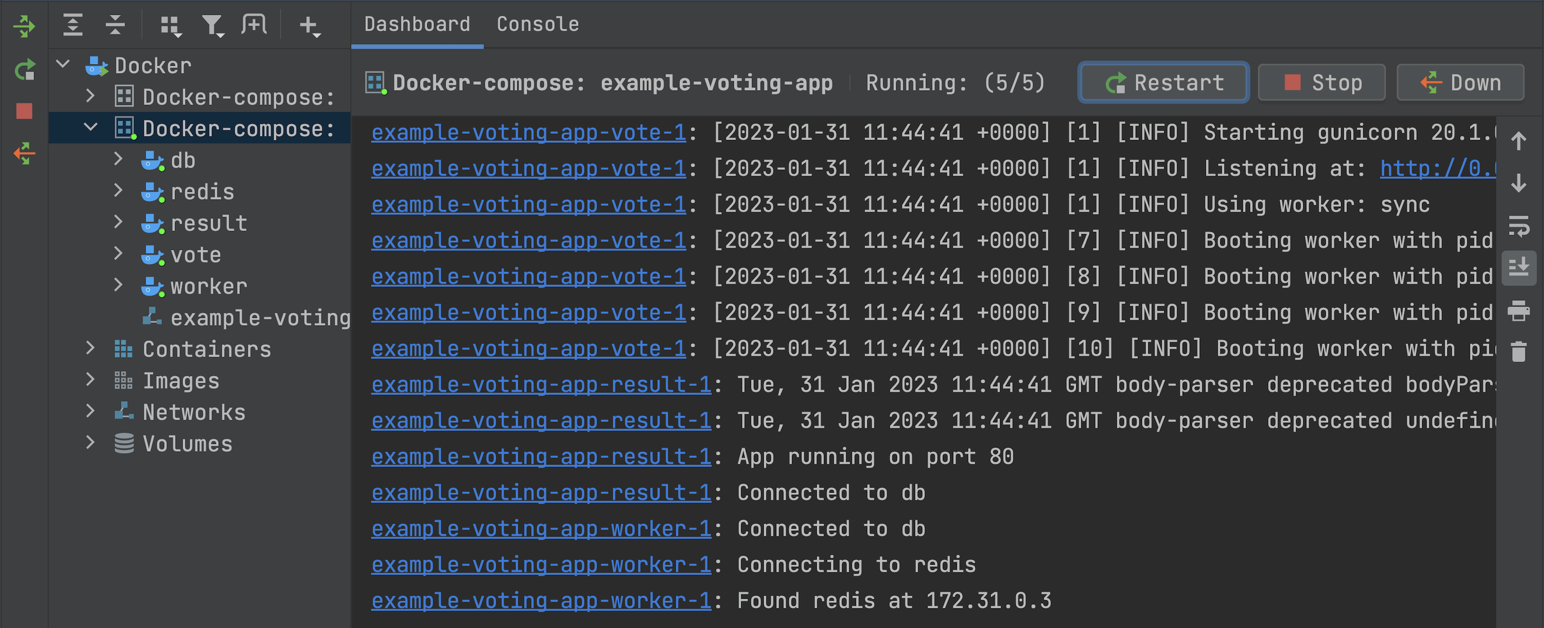 Docker Compose 节点的 Dashboard(仪表板)标签页现在将来自各个 Docker Compose 容器的日志拉取到一处显示,并实时更新。