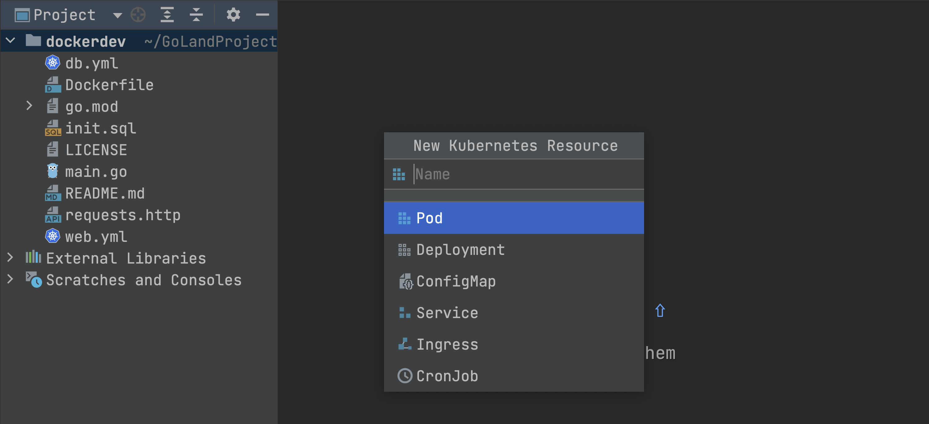 为了使 Kubernetes 文件的创建更简单,我们在右键点击 Project(项目)工具窗口时出现的 New(新建)菜单中添加了新操作 Kubernetes Resource(Kubernetes 资源)。