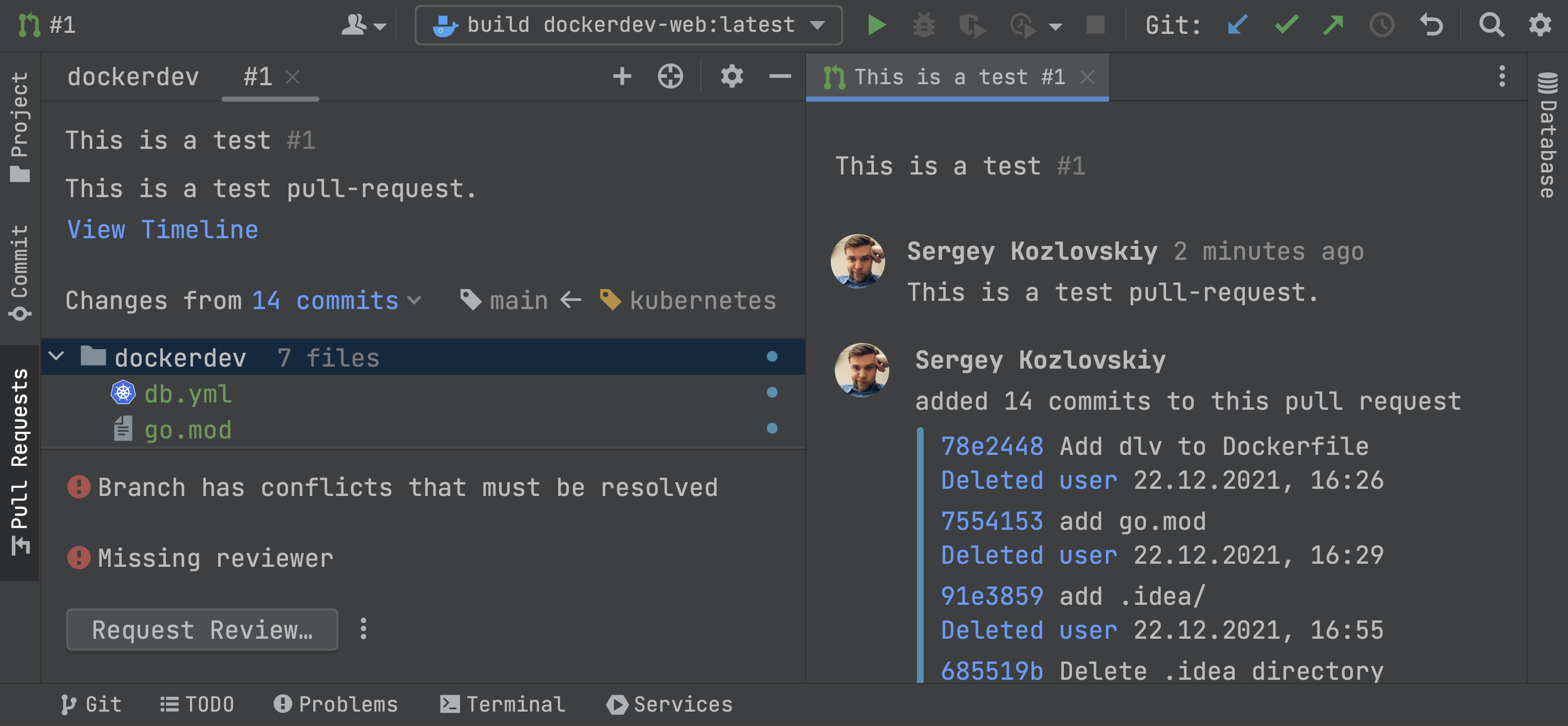 我们重做了 Pull Request(拉取请求)工具窗口。 它现在会为您打开的每个拉取请求提供一个专用标签页。 标签页会立即显示已更改文件的列表,但它提供的信息比先前更少, 这让您可以更好地专注于当前任务。 现在,可以通过一个新增的专属按钮轻松执行拉取请求当前状态下最重要的操作。