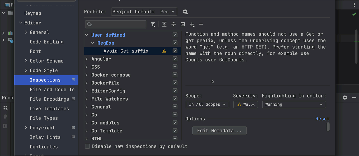 转到 Settings | Editor | Inspections(设置 | 编辑器 | 检查),按 + 图标。 从列表中选择 Add RegExp Search Inspection(添加正则表达式搜索检查),在新出现的对话框中即可设置新检查。 选择所需语言,使用左侧面板中的提示构建正则表达式,然后指定所需替换。 您还可以指定 IDE 在项目中高亮显示的方式。