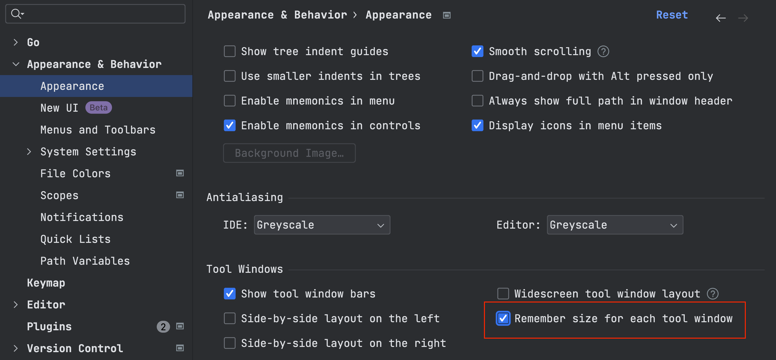 我们引入了一个新的布局选项,允许您统一侧面工具窗口的宽度或保留在自定义布局时自由调整其大小的能力。 新的 Remember size for each tool window(记住每个工具窗口的大小)复选框位于 Settings | Appearance | Appearance & Behavior | Tool Windows(设置 | 外观 | 外观与行为 | 工具窗口)中。