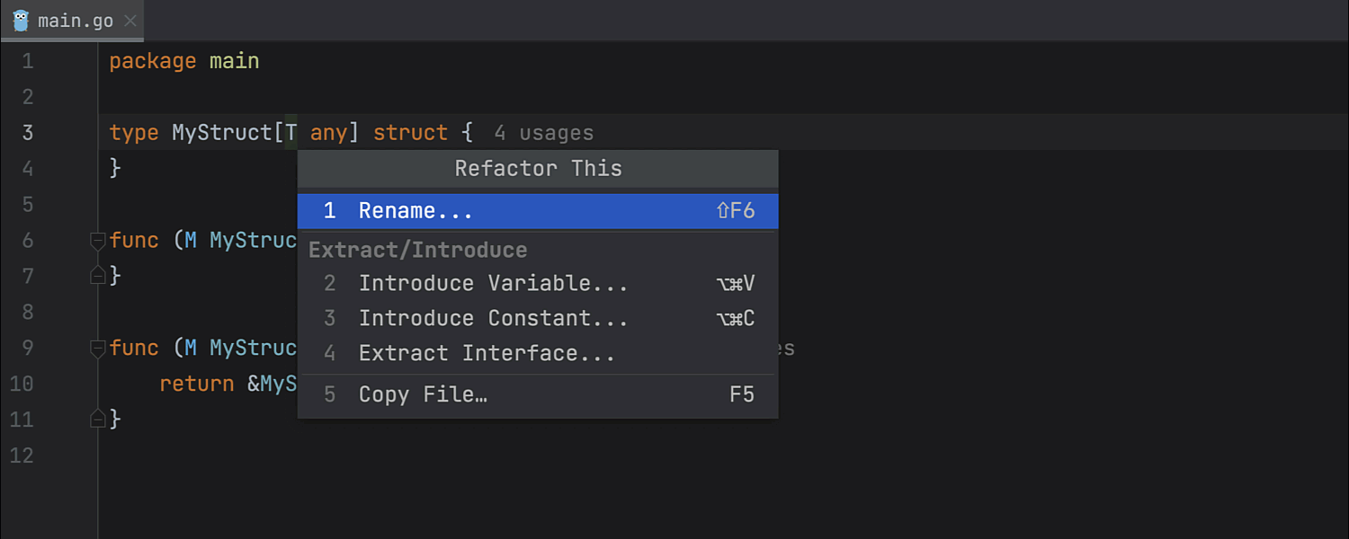 重命名结构体中的类型形参时,Rename(重命名)重构将建议更改对应接收器。