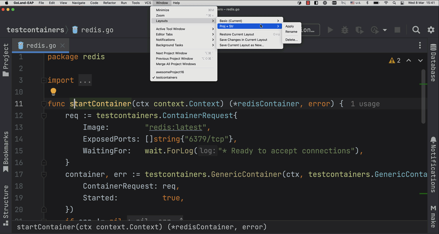 我们通过在智能模式下执行 Scanning files to index…(正在扫描要建立索引的文件)进程改进了 IDE 启动体验,这样可以在启动过程中更早地提供完整的 IDE 功能。 打开项目时,GoLand 会使用项目先前会话中的现有缓存,并同时查找要建立索引的文件。 如果在扫描中没有发现更改,IDE 将准备就绪,消除此前启动时建立索引所造成的延迟。