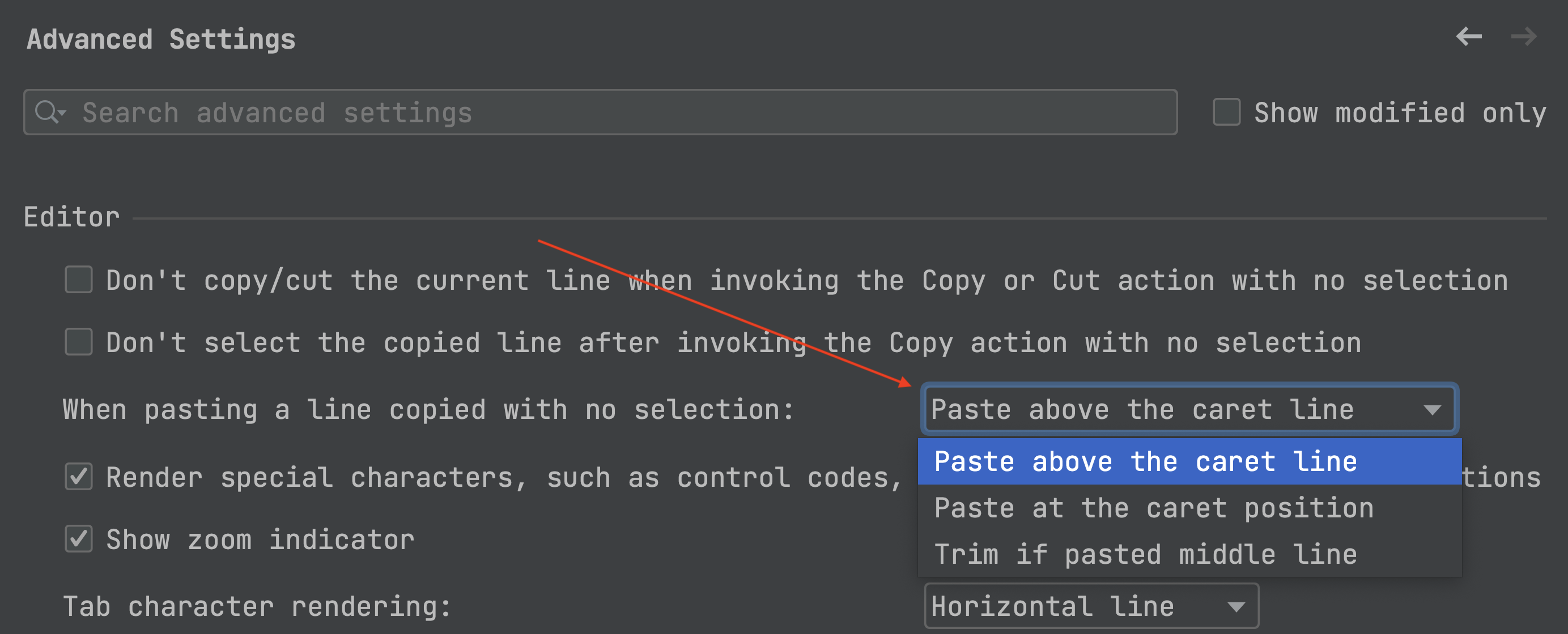 在 Settings | Advanced Settings(设置 | 高级设置)中,找到 Editor(编辑器)版块然后从下拉列表中为 Paste(粘贴)操作选择需要的行为。