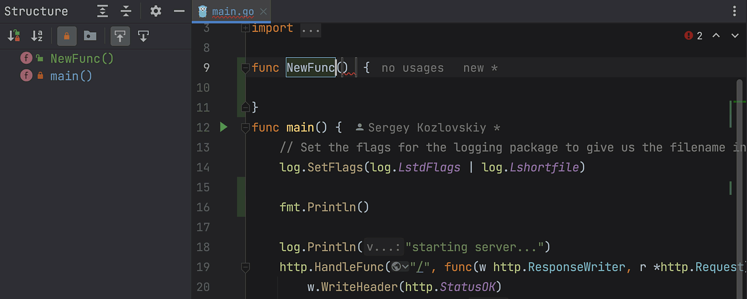 在之前的版本中,我们引入了在所有函数和类型附近显示的用法,显示函数或类型在当前项目中被引用的频率。 另外,启用版本控制集成后会显示代码作者。