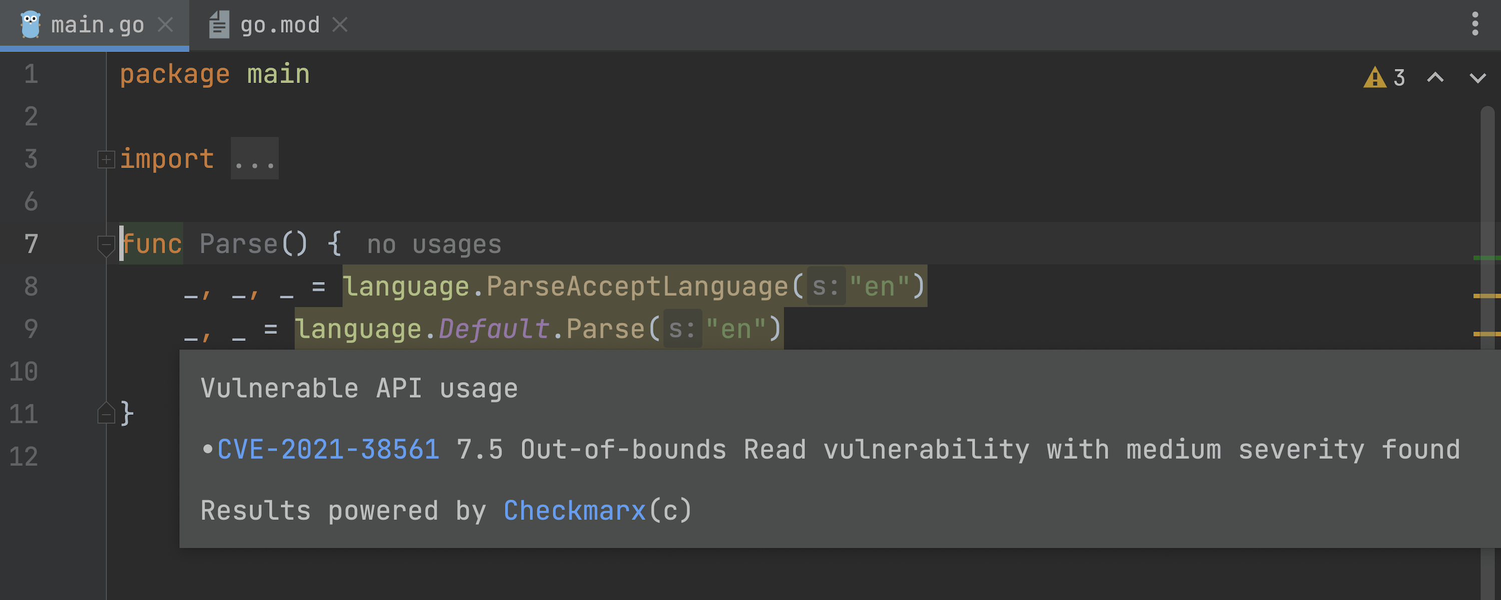 GoLand 还会在编辑器中高亮显示来自存在已知漏洞的软件包的方法调用。 将鼠标悬停在高亮显示的代码上可以看到一个弹出窗口,其中包含漏洞相关信息以及指向详细描述的链接。