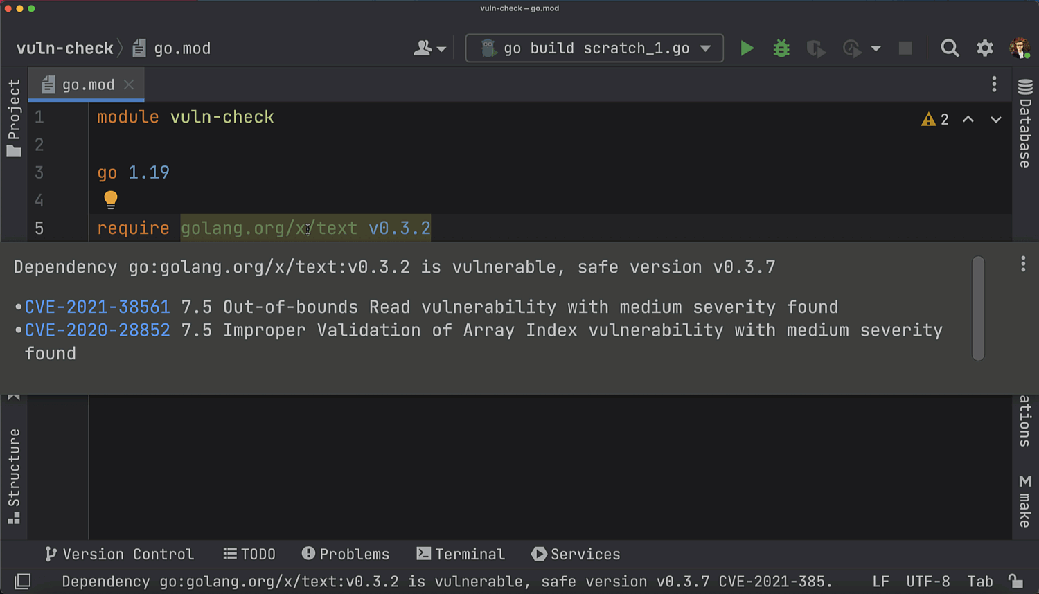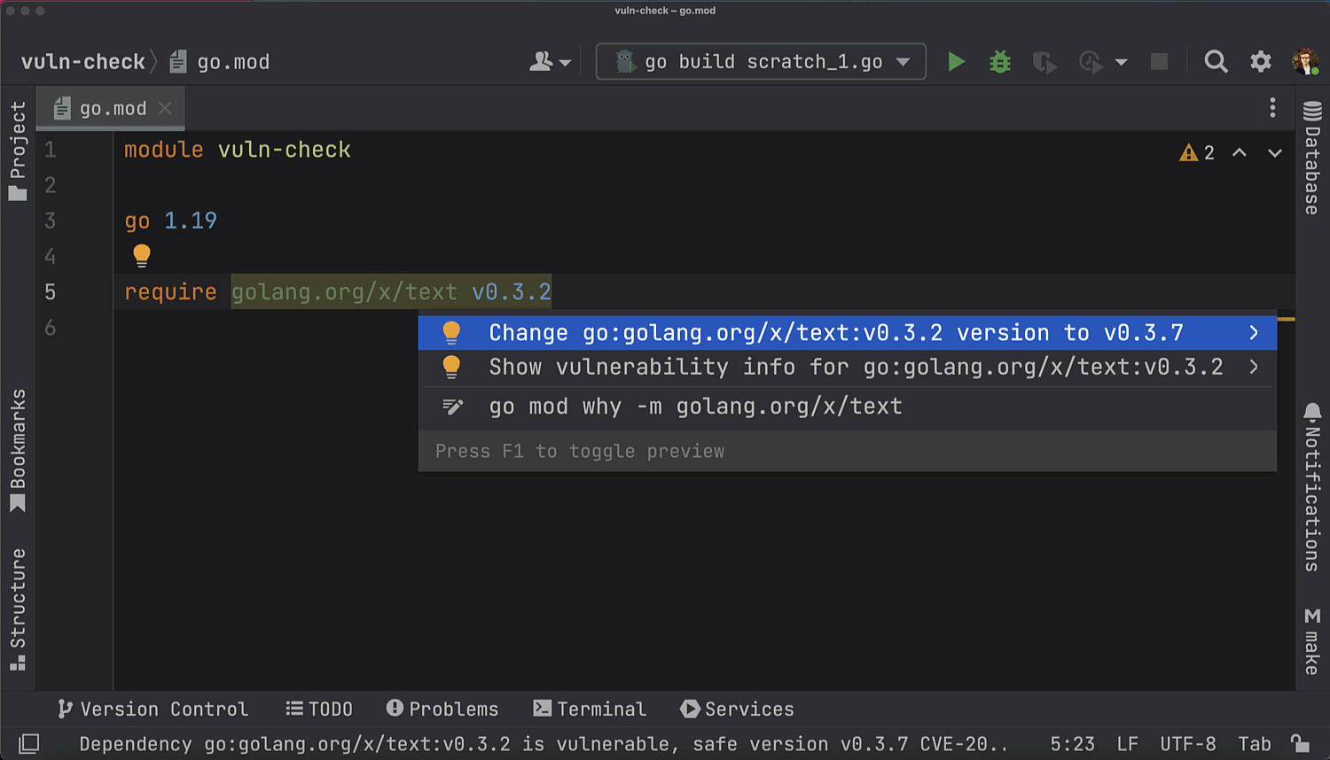 您可以将光标置于 go.mod 中高亮显示的软件包上,按 Alt+Enter,然后选择 Change package-name version to v0.x.x(将软件包名称版本更改为 v0.x.x)快速修复,将依赖项更新为没有漏洞的版本。