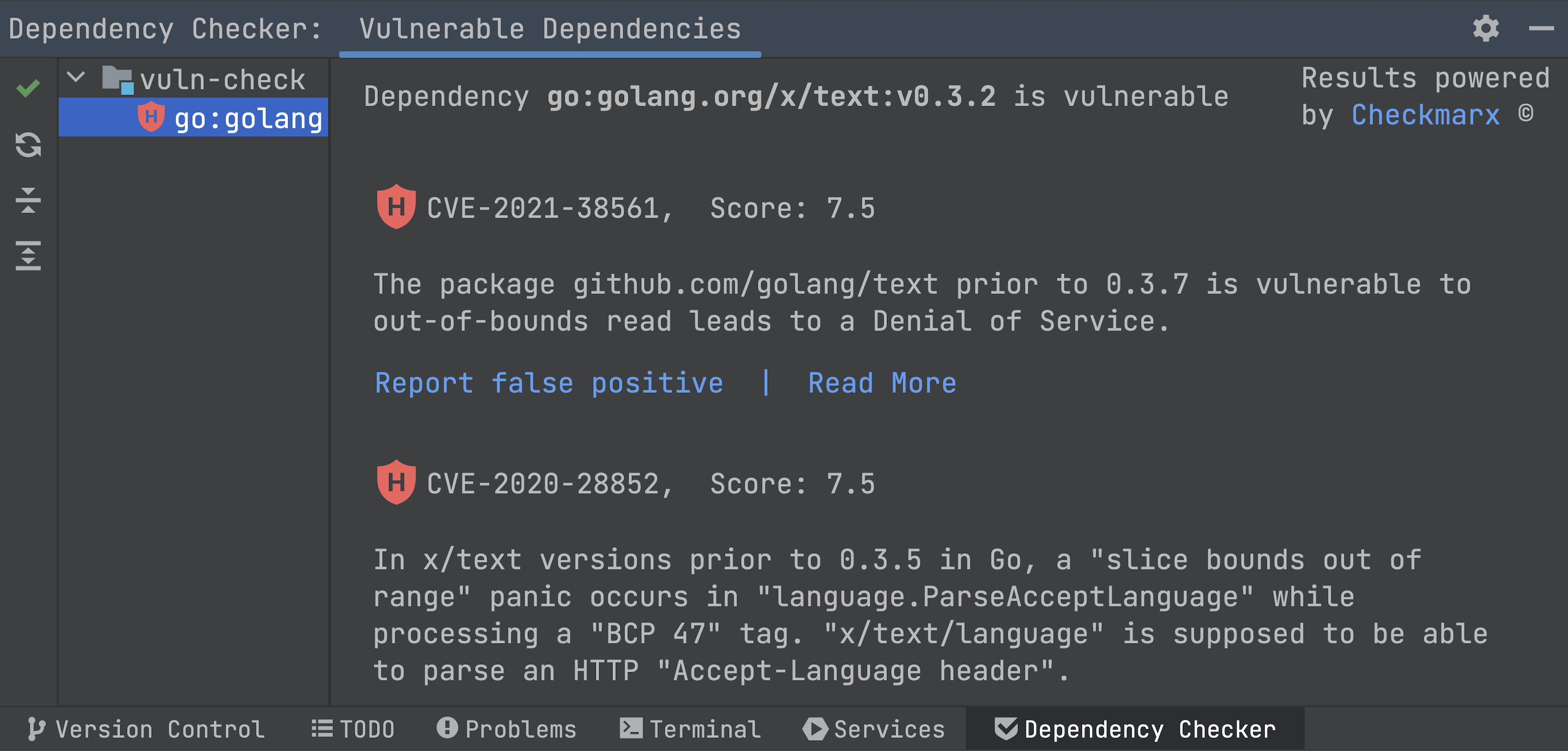 GoLand 现在可以高亮显示 go.mod 中存在已知漏洞的软件包。 将鼠标悬停在高亮显示的代码上或按 Alt+Enter,选择 Show vulnerability info for …(显示漏洞信息…),GoLand 将显示漏洞列表以及指向详细描述的链接。 漏洞相关数据由软件安全公司 Checkmarx 提供。