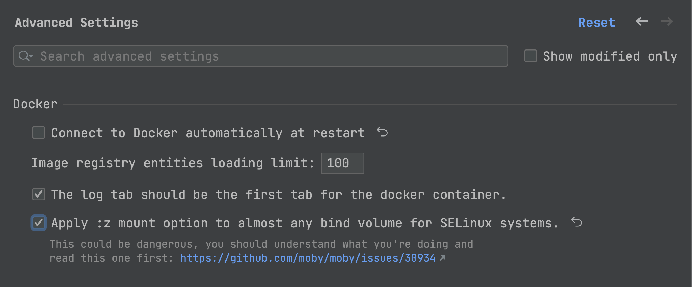 您现在可以将 :z 配置标志添加到 Docker 绑定装载,从而将卷连接到 SELinux 工作站上的 Docker 容器。 转到 Settings | Advanced Settings | Docker(设置 | 高级设置 | Docker)可启用此功能。