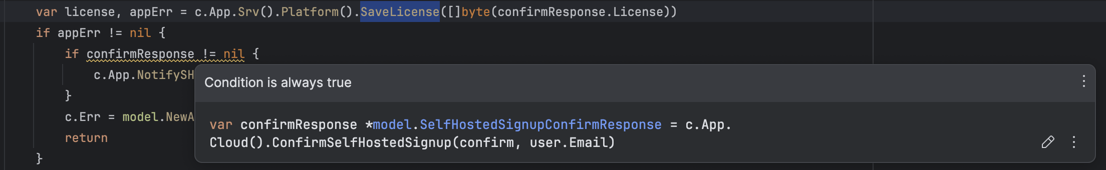数据流分析在 GoLand 2023.3 中引入,在 2024.1 中,功能已完善到可以默认打开。 GoLand 的 DFA 目前支持三种检查:Constant conditions detection(常量条件检测)、Potential nil dereference(潜在 nil 解引用)和 Error may be not nil(错误可能不为 nil)。 在我们的博文中详细了解这些发展。