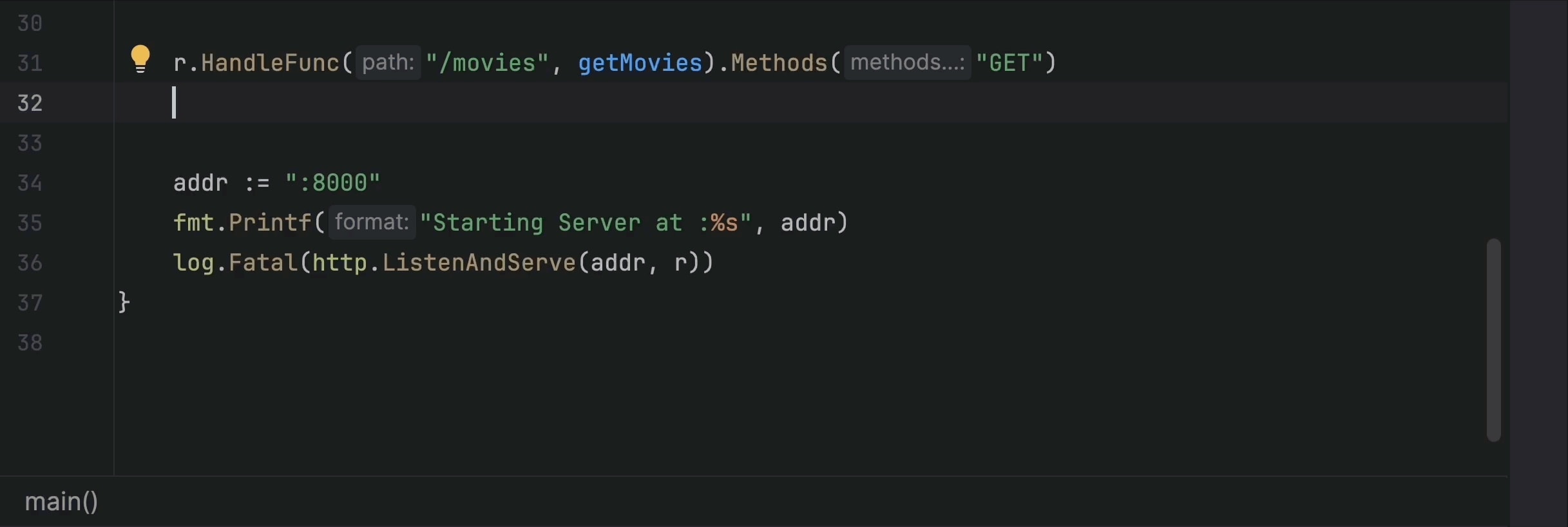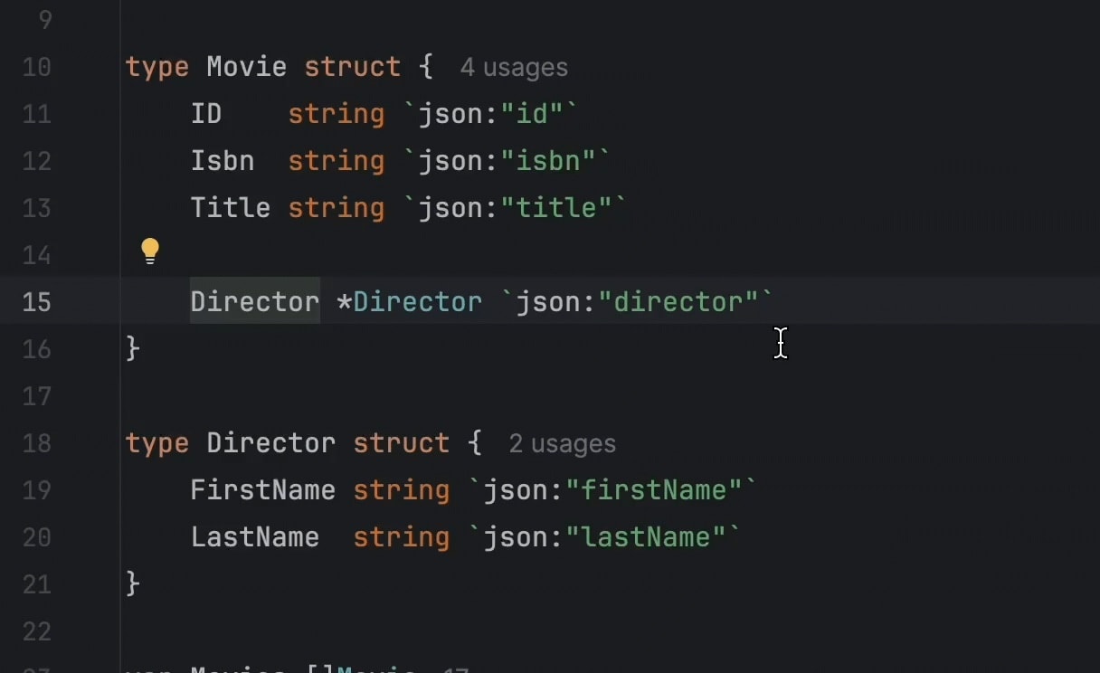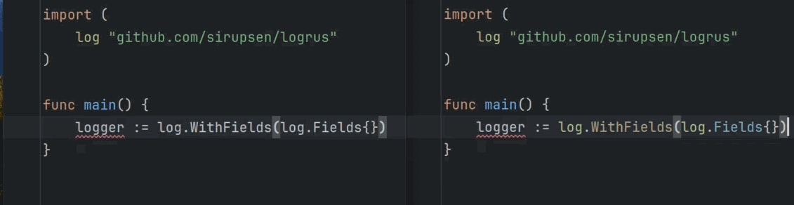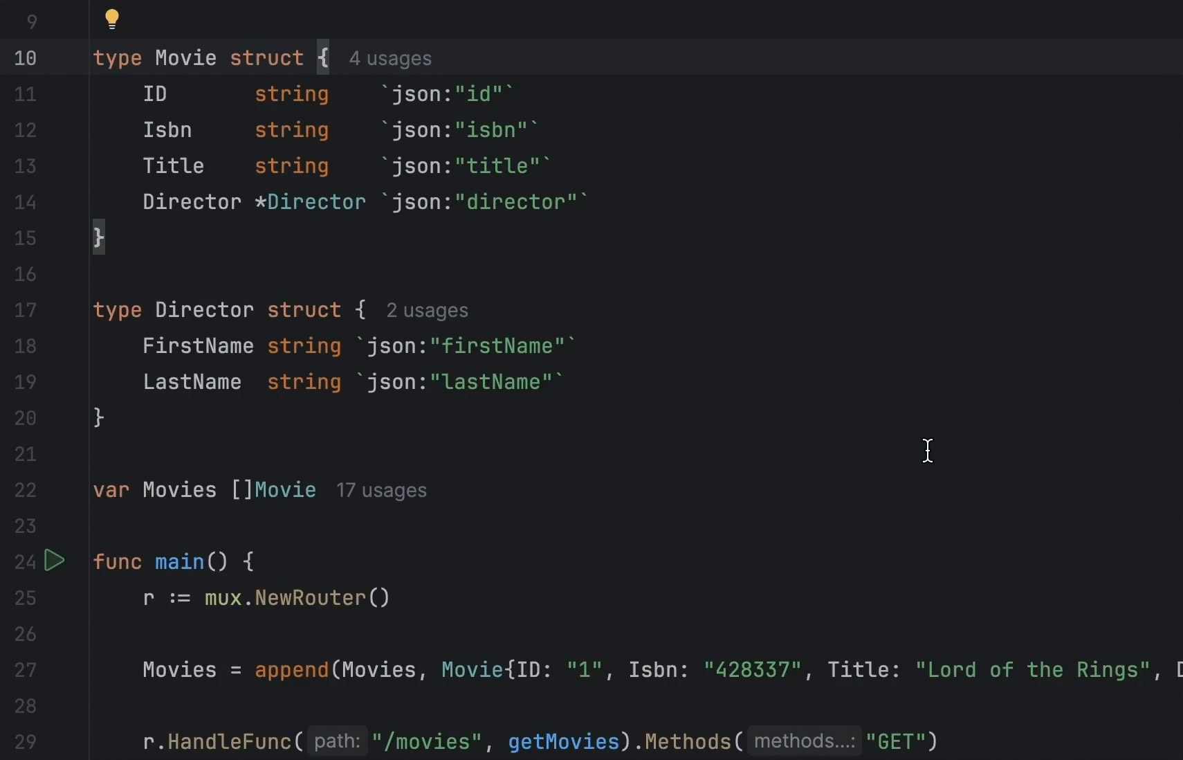 在 2023.3 中,函数和方法块获得了内联补全。 在 2024.1 中,我们还将为结构和接口声明启用内联补全。 当代码补全在类型声明中提供建议时,它会考虑用法的上下文以及父结构和引用。 这提高了基于 AI 的建议的相关性。