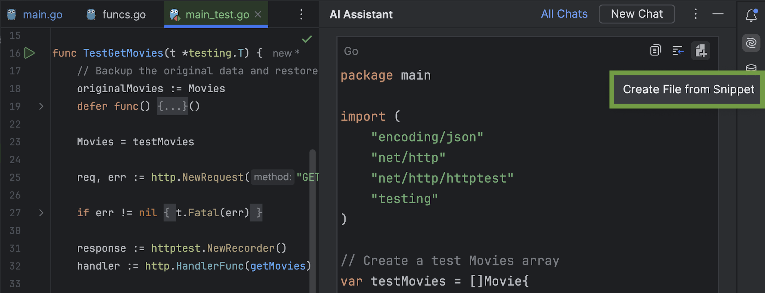 从 2024.1 版本开始,您可以导出包含 AI 聊天生成的代码段的文件。 在聊天中提问时,您还可以附加文件提供额外上下文。