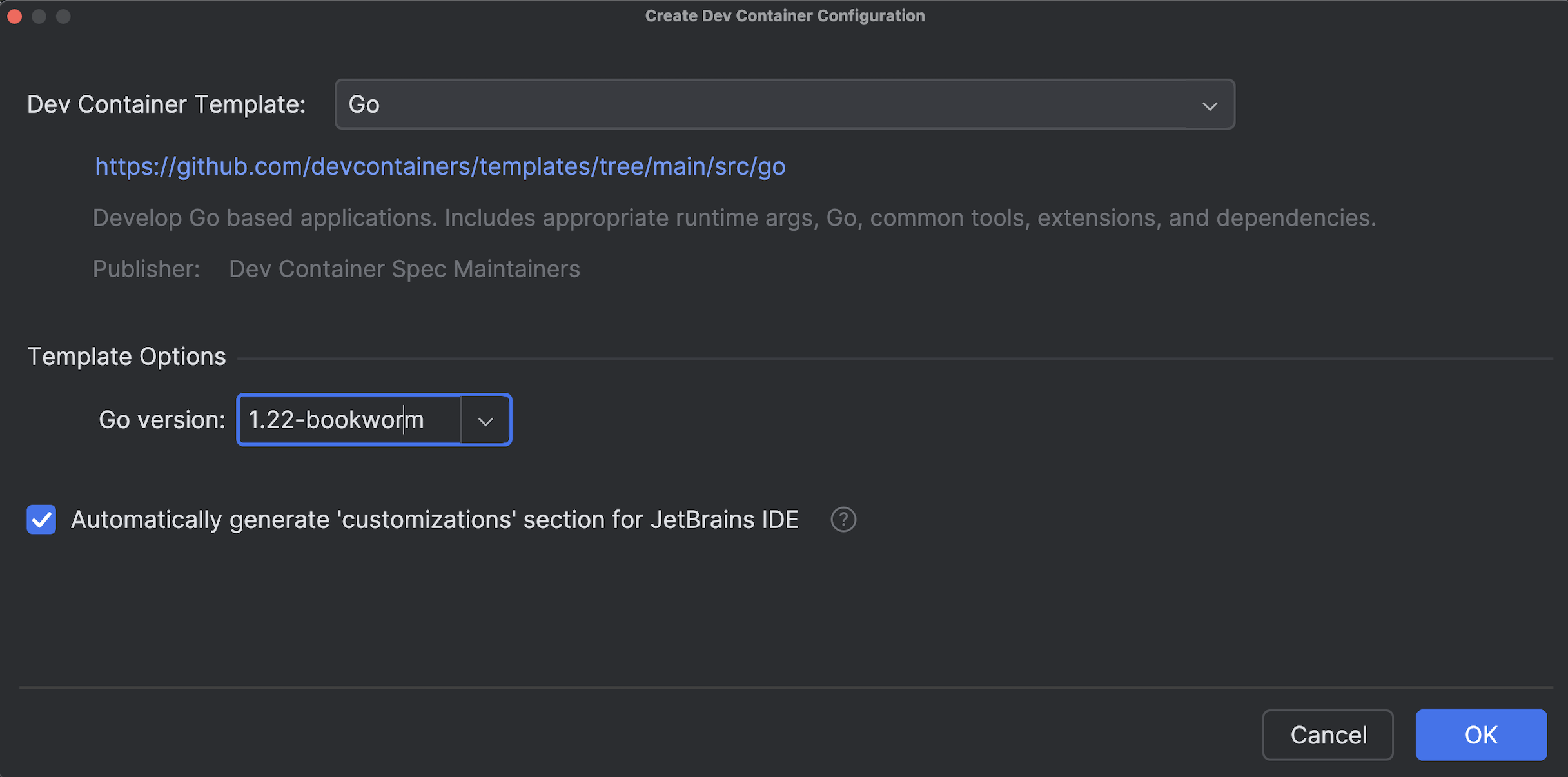 添加的设置允许用户直接在 devcontainer.json 文件中配置其 JetBrains 后端 IDE(例如 GoLand 或 CLion)。
