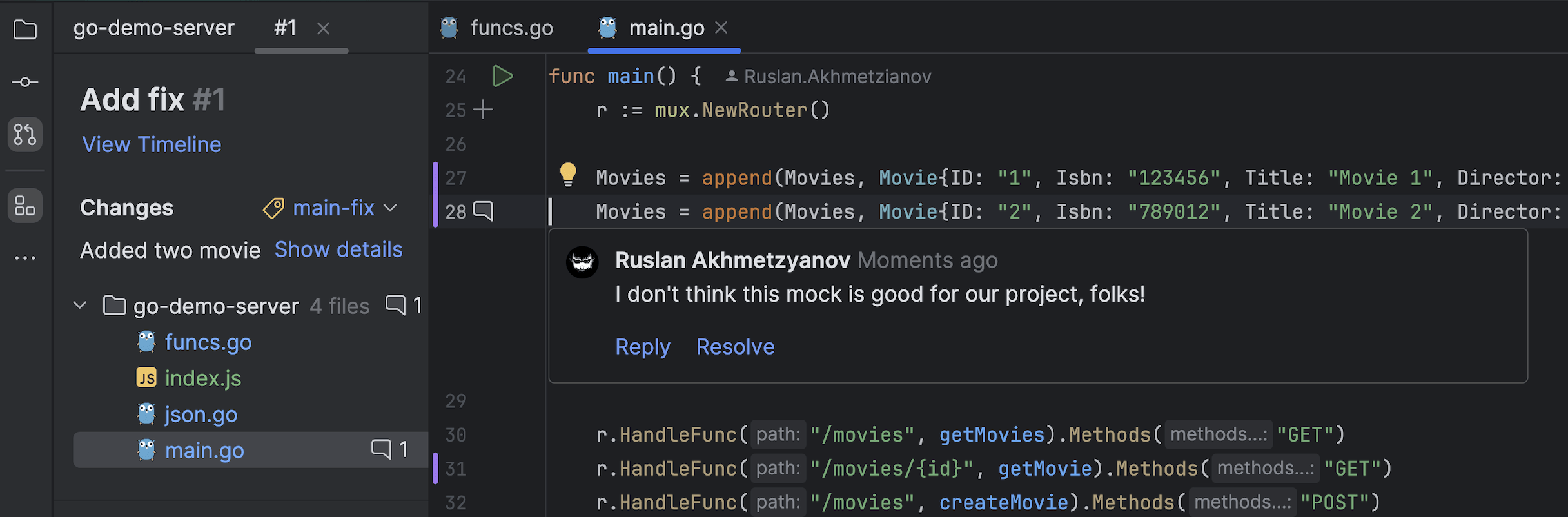 现在,GoLand 为 GitHub 和 GitLab 用户提供了更加简化和敏捷的代码审查工作流。 得益于新审查模式的实现,作者和审查者现在可以直接在编辑器中无缝互动。 了解详情。