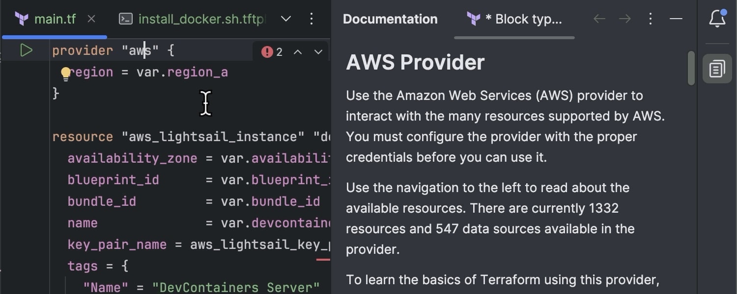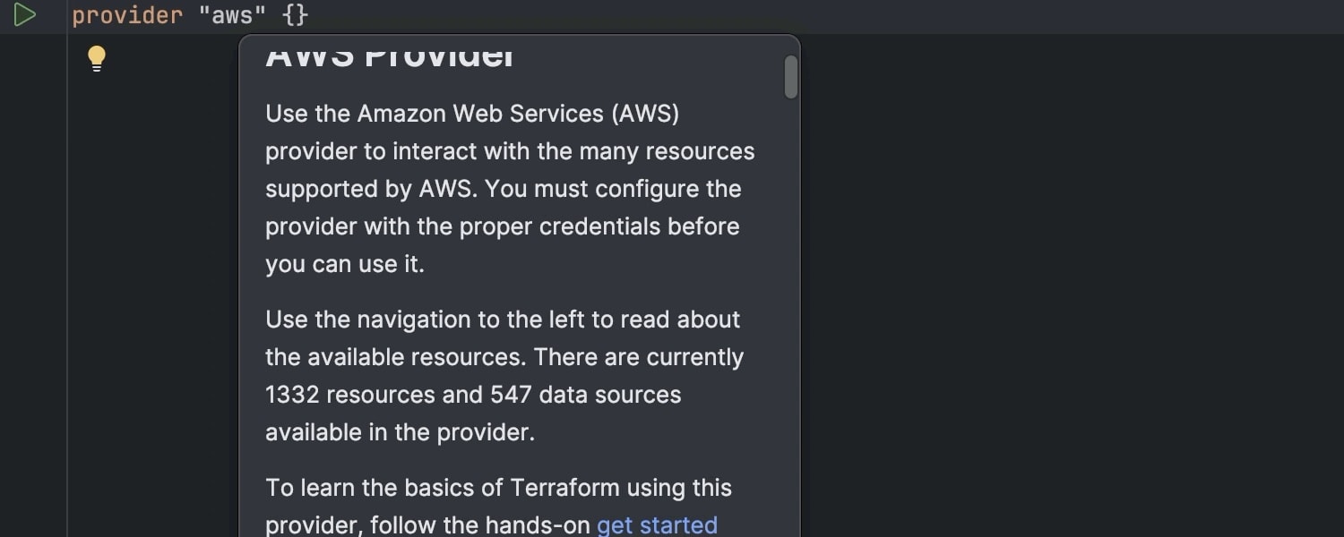 Terraform 插件现在为超过 3,900 个第三方 Terraform 提供程序提供扩展的代码补全,使开发者能够更轻松地高效编写代码。 此外,您还可以直接在 IDE 中找到每个提供程序的最新文档及其特定版本。