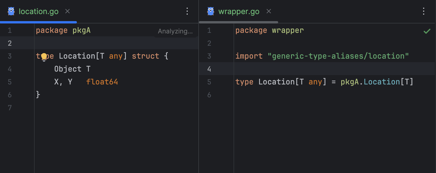 Go 1.24 引入了使用类型形参定义类型别名的功能。 GoLand 现在通过适当的高亮显示、导航和代码洞察完全支持此语法。