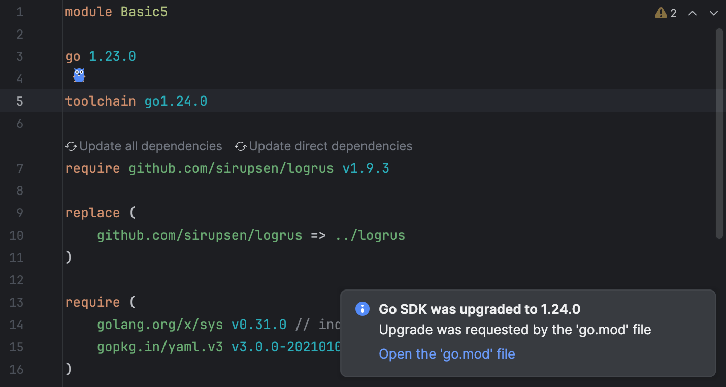 toolchain 指令的改进通知和支持 当项目的 SDK 由于 go.mod 中的 toolchain 指令发生变化时,GoLand 现在会显示通知。 此外,我们还改进了代码库,使 GoLand 可以更有效地处理此指令。