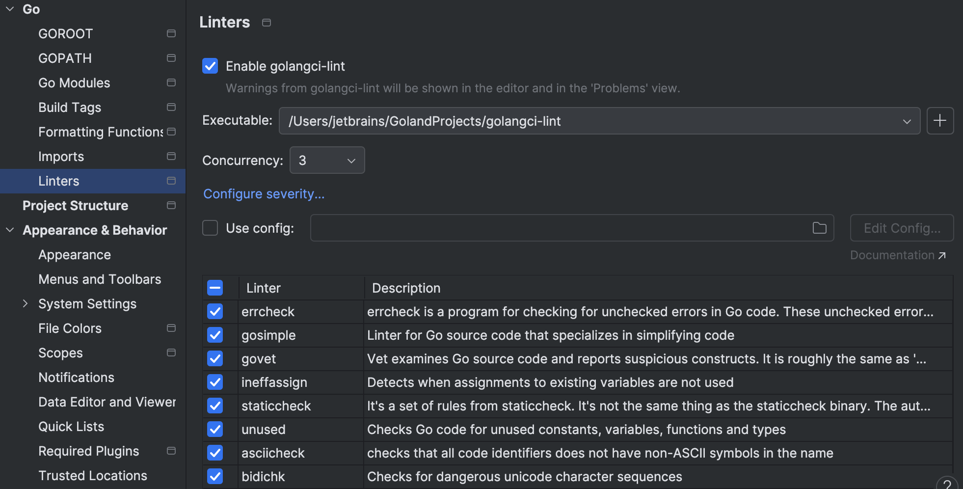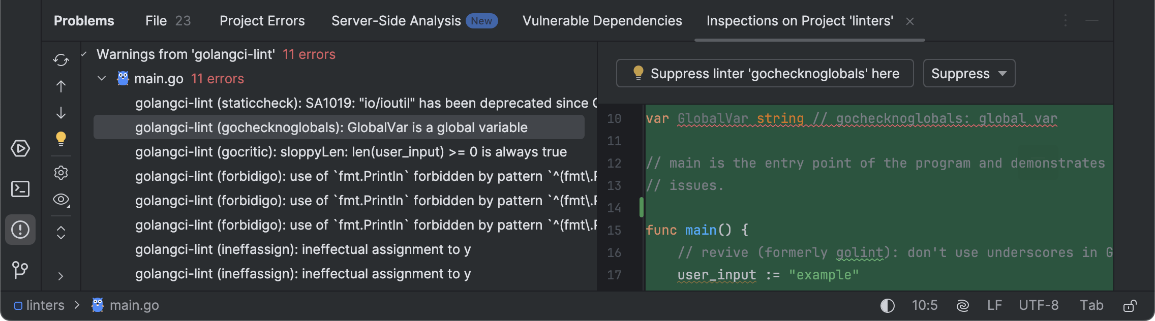 GoLand 现已集成 Go Linter 插件,为您带来对 golangci-lint 的支持。 这可以让您轻松配置和微调 linter。 您可以选择对您最重要的特定检查来分析和增强您的 Go 代码。 在 GoLand 中,linter 发挥实时检查的作用,在您运行代码之前捕获潜在问题。