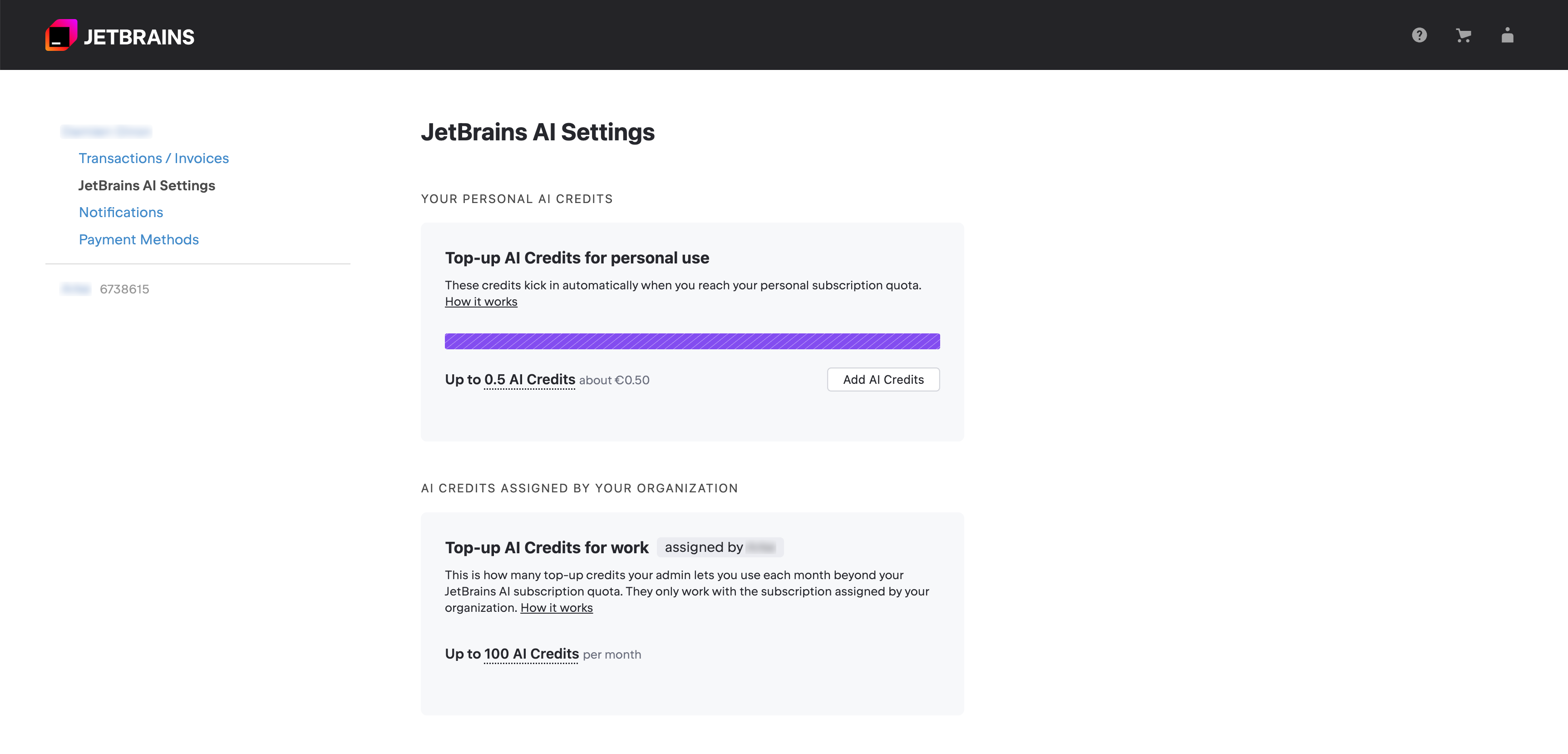 您可以通过 JetBrains AI 微件,或在 JetBrains Account 设置中管理 充值 AI 点数。