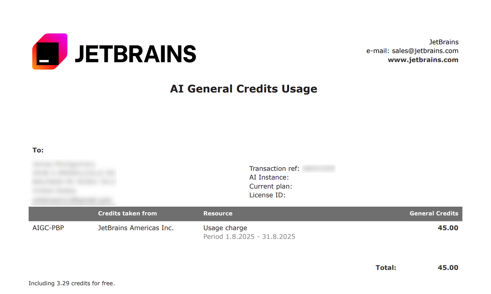 每月初,您将收到一份上月 充值 AI 点数 用法明细的报告。 报告将发送到关联您 JetBrains Account的电子邮件地址。