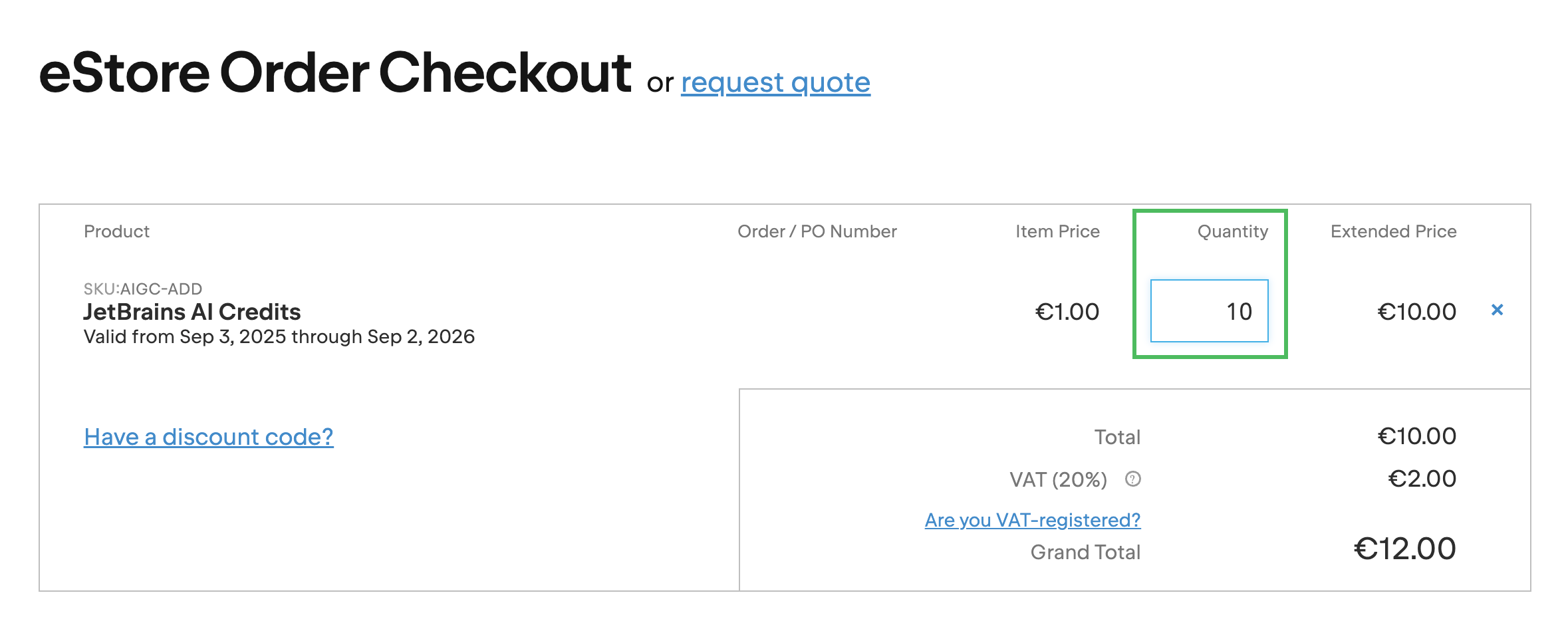在 eStore 订单结账 页面上,指定要购买的 充值 AI 点数 数量。