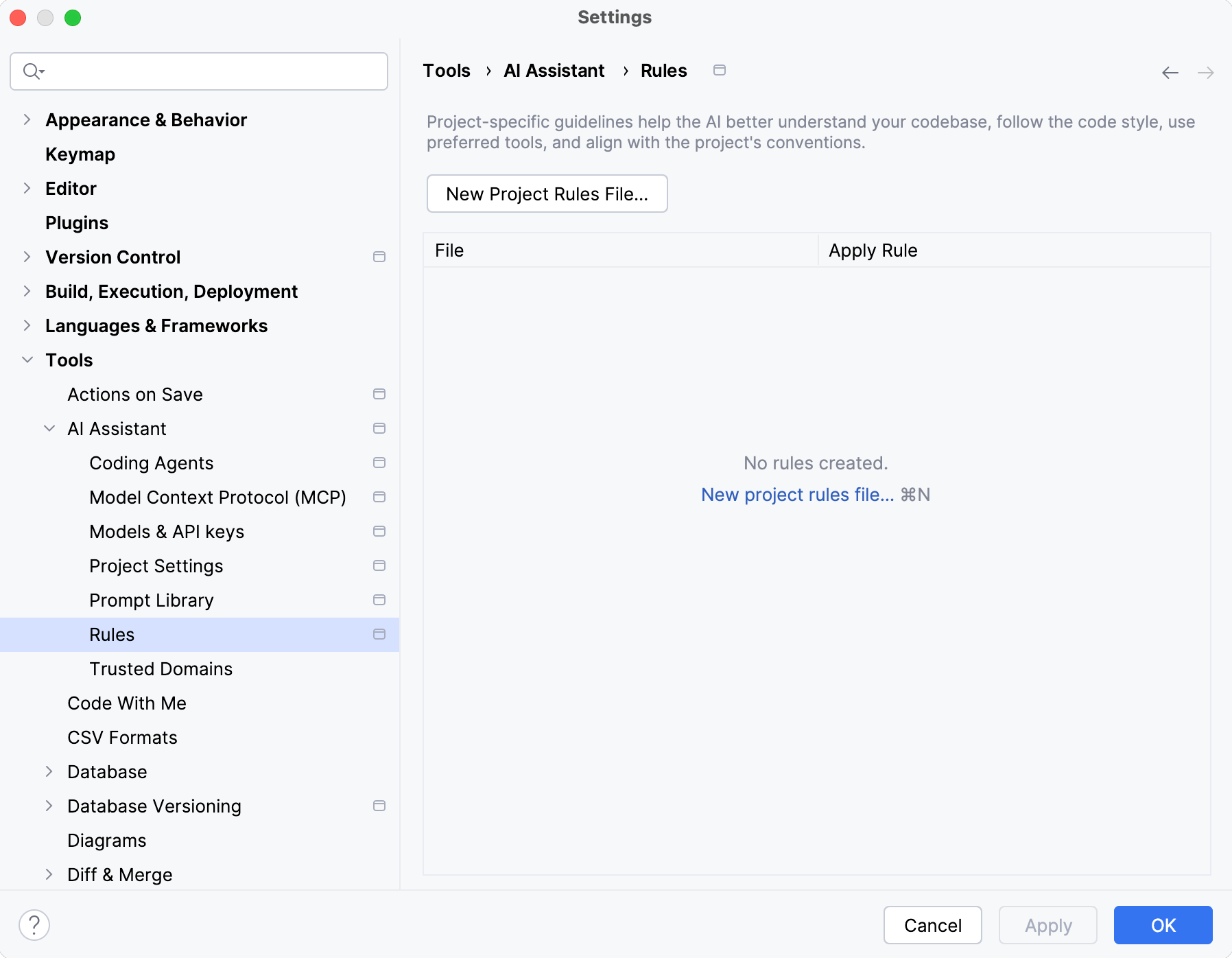 规则使用此页面 创建可供 AI Assistant 使用的项目专属指南,以提高其响应的相关性。项目描述新建项目规则文件点击以在项目根目录中创建 .aiassistant/rules 文件夹,并在其中添加一个 .md 文件。如需更多信息,请参阅 配置项目规则。最后修改日期: 2025年 12月 5日提示库受信任的域