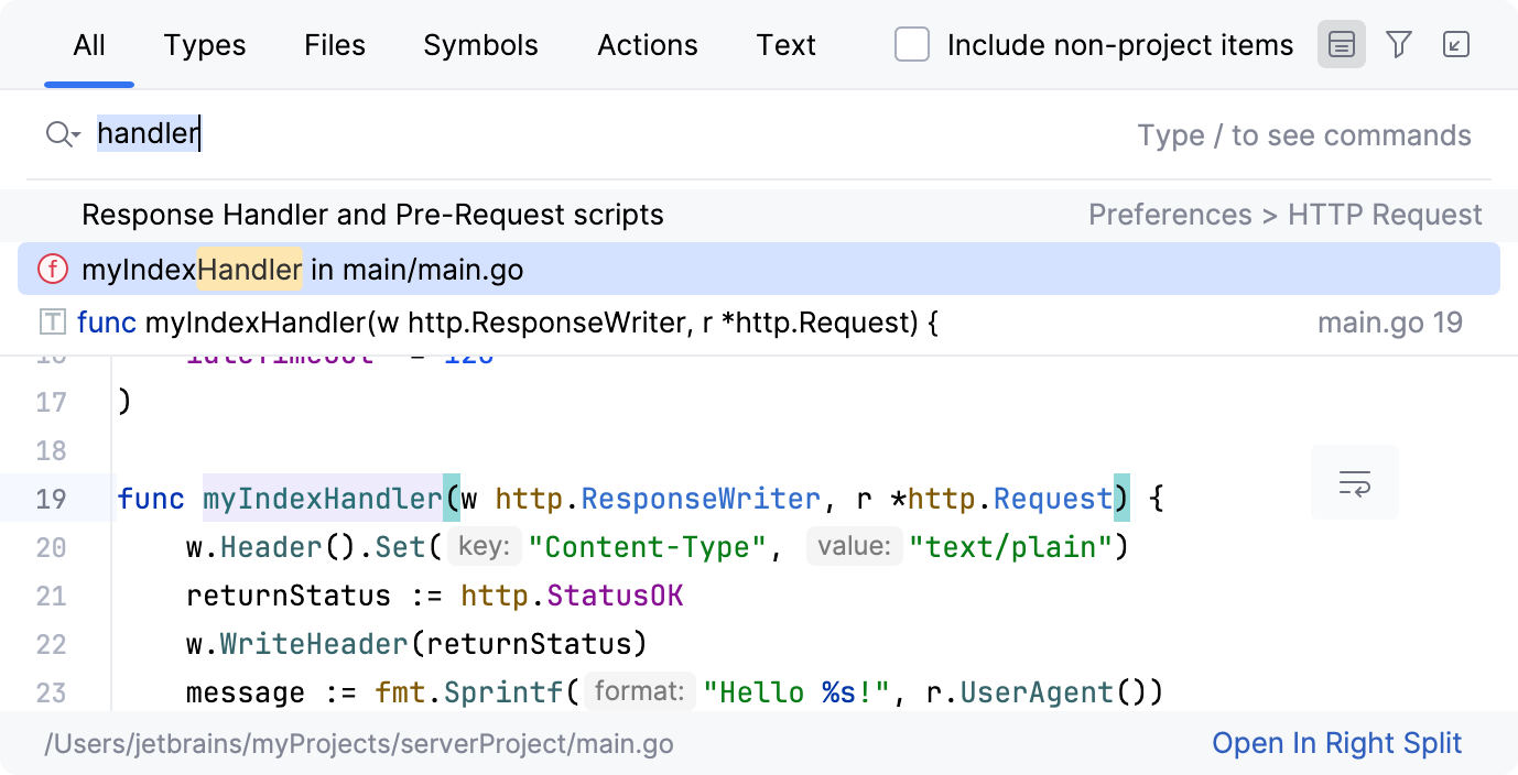 GoLand 会根据特定触发条件(例如关闭文件或从 IDE 切换焦点)自动保存您的工作,无需手动保存按钮。 用户可以通过系统设置修改此自动保存功能。 此外,GoLand 集成了 保存时的操作 ,可在保存时执行代码格式化和整理导入等任务。 在 IDE 内进行导航和搜索时,GoLand 提供了 Search Everywhere 功能,可高效定位文件和命令,类似于其他 IDE 中的命令面板。