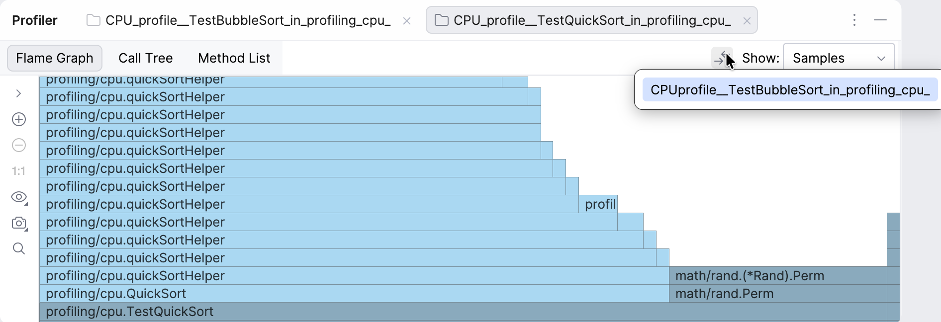 在 分析器 工具窗口( )中,收集的数据显示在多个标签页上: 火焰图、 调用树 和 方法列表。