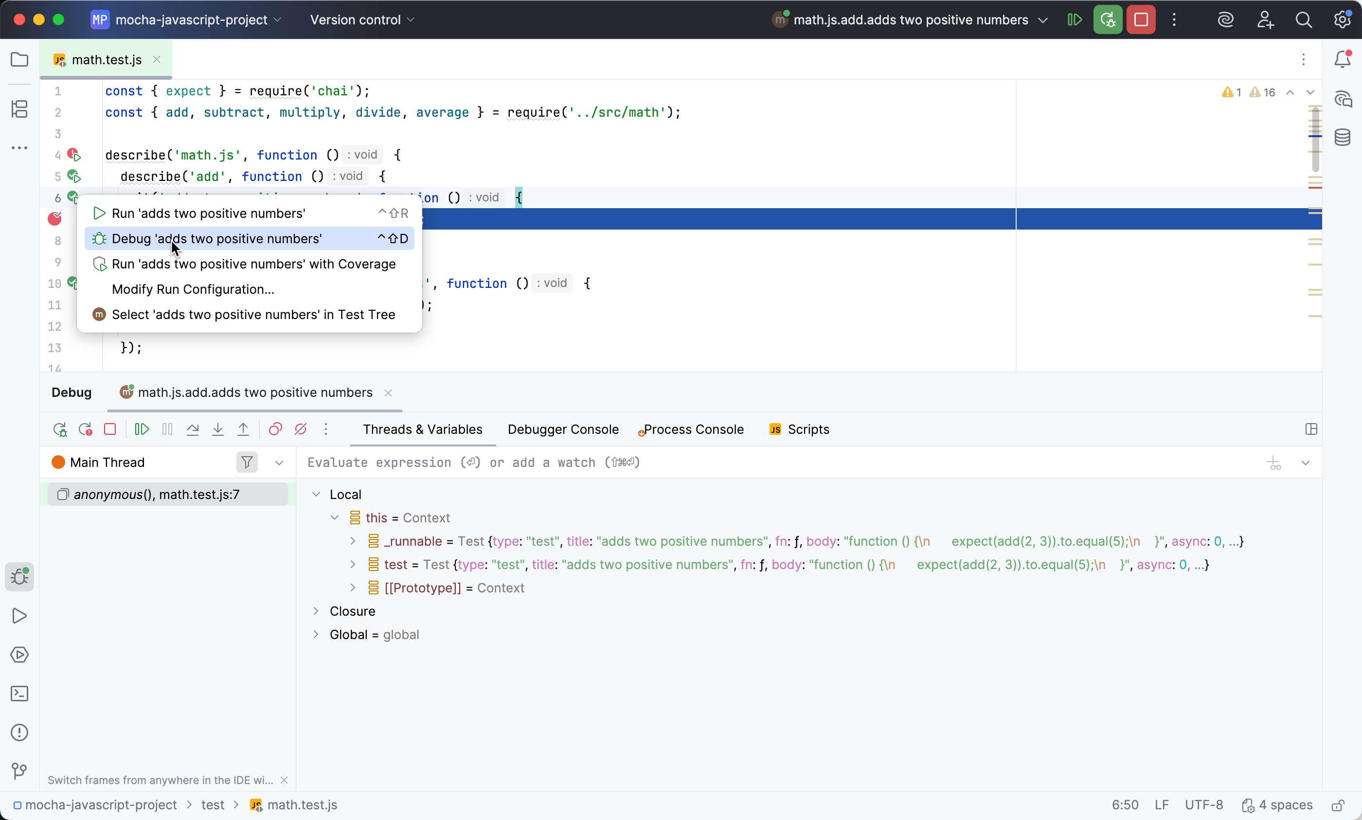 创建一个 Mocha 运行/调试配置 如上所述。
