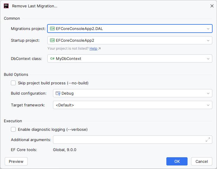 在对话框中,指定 移除最后一次迁移的选项。 默认情况下,JetBrains Rider 会保存之前调用 EF Core 命令时的选项,并自动填充大部分字段。 如果您想禁用此功能,请在 工具 | EF Core UI 设置页面  Ctrl+Alt+S 中清除 自动填充常规选项 复选框。