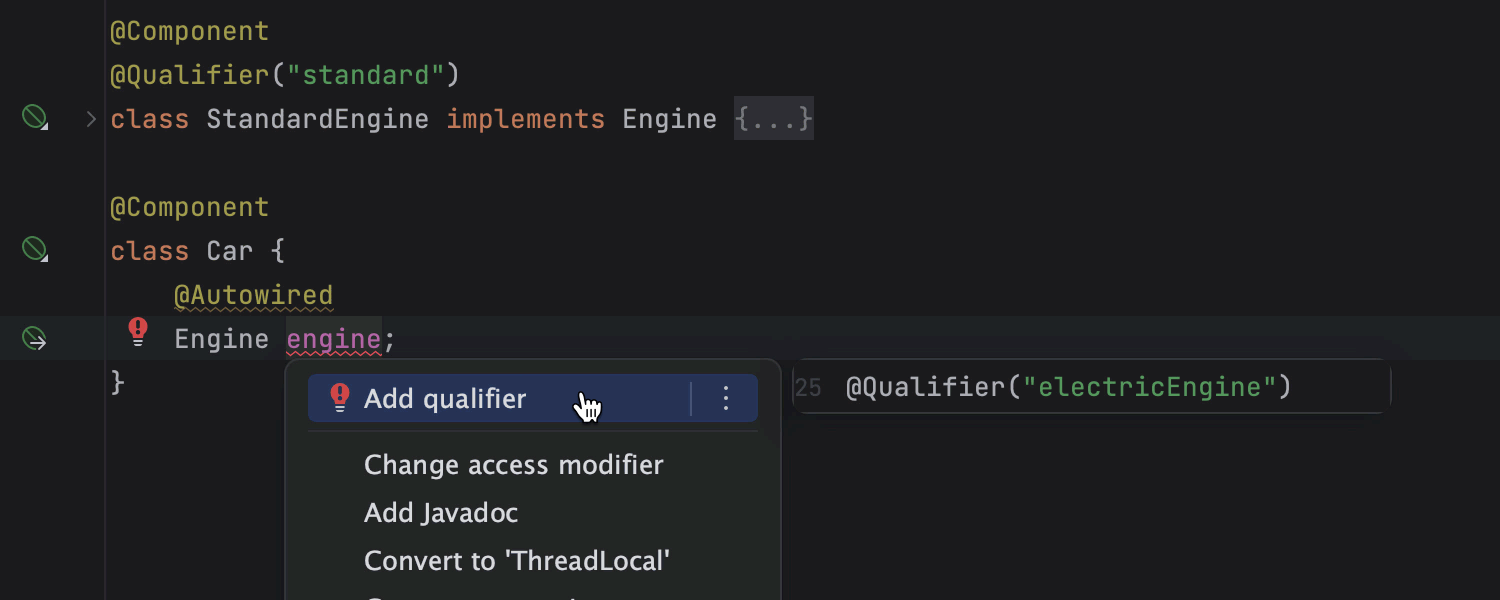 IDE 会在您输入代码时自动建议 Bean,并为您生成自动装配代码,从而帮助您专注于构建功能,而非编写样板代码。