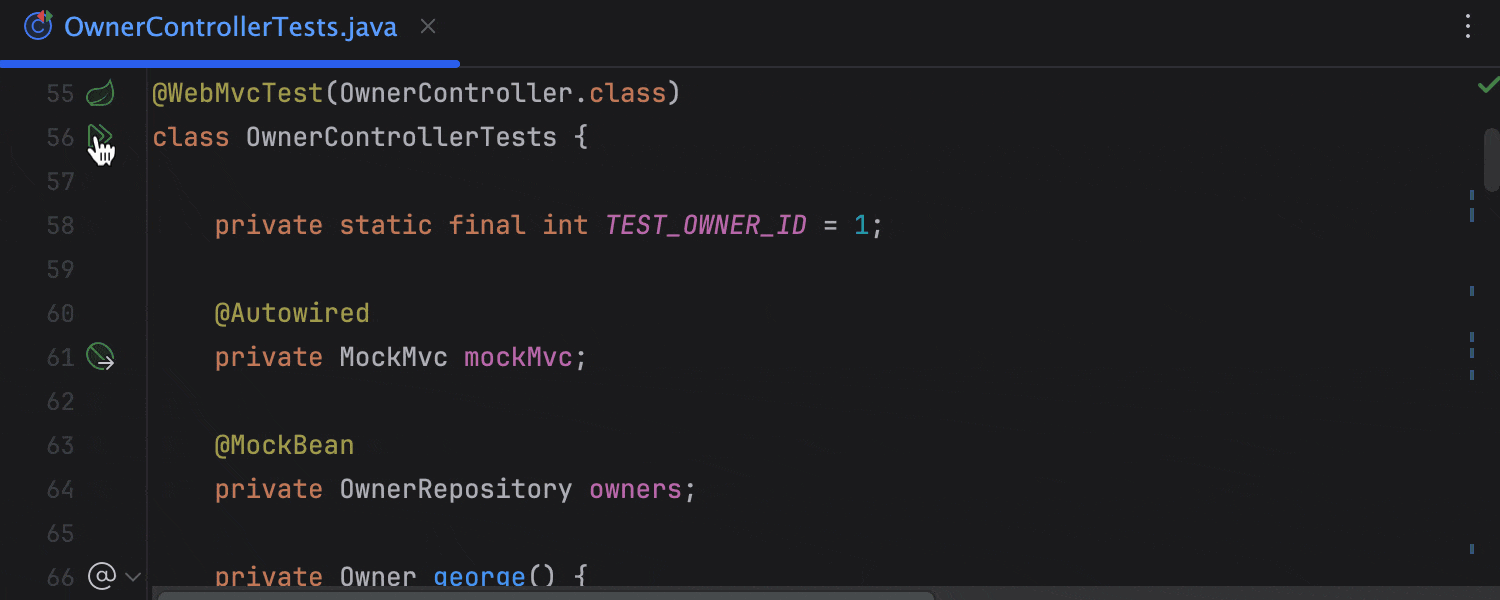 IntelliJ IDEA 会将带有 Spring 测试注解的类识别为测试,并帮助您从编辑器运行。 此外,您可以直接从 Services(服务)工具窗口轻松启动一系列测试。
