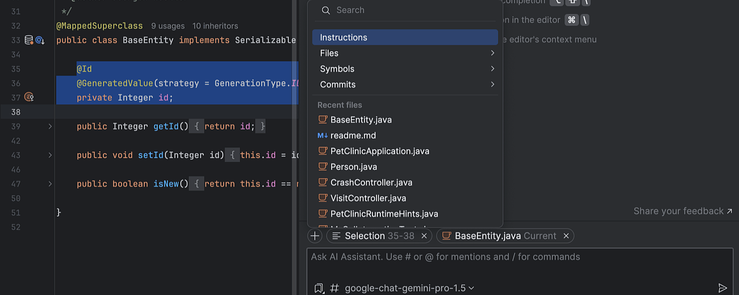 为了帮助您顺利完成开发工作,IntelliJ IDEA 2025.3 引入了命令补全,这种新方式可以直接通过代码补全访问上下文感知操作。