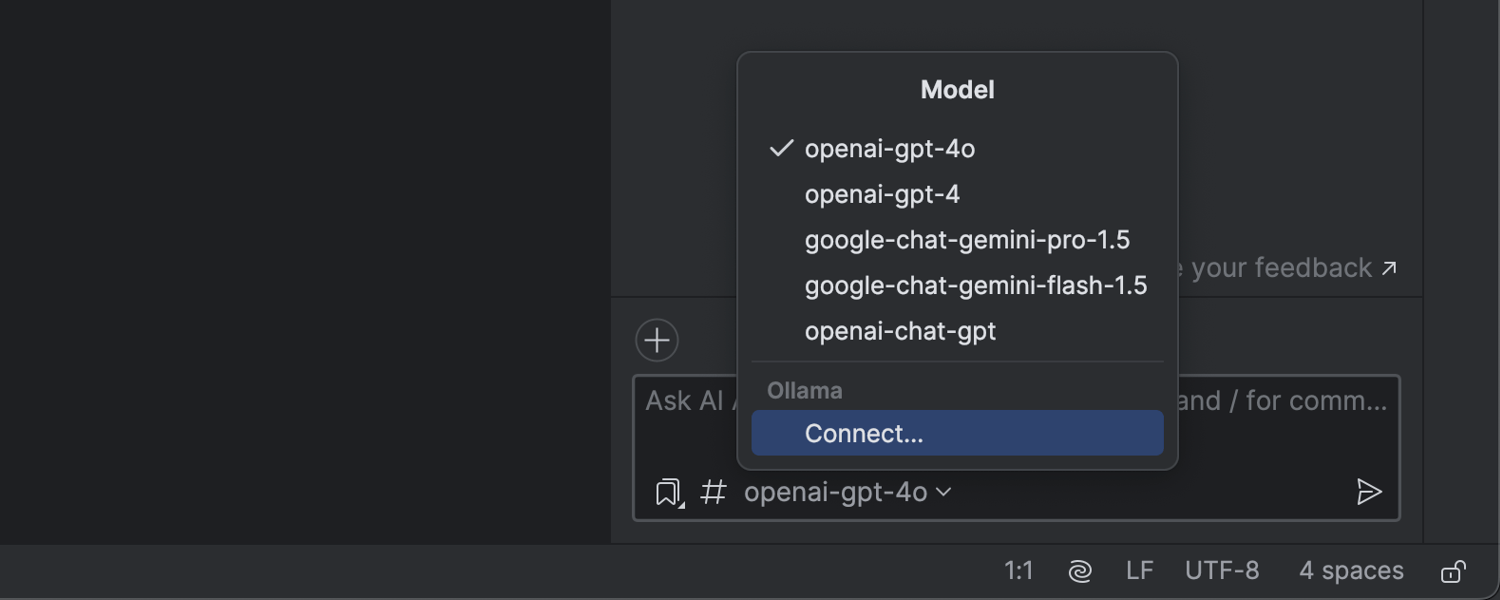 借助 BYOK,您无需登录 JetBrains AI 即可使用自己的 API 密钥连接到 OpenAI、Anthropic,或任何兼容 OpenAI API 的本地模型。 这样,您可以对 IntelliJ IDEA 中 AI 的使用方式拥有更大的掌控权,如果您倾向于使用特定服务提供商,它无疑是您的理想之选。