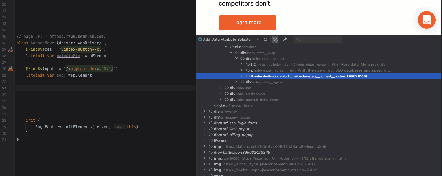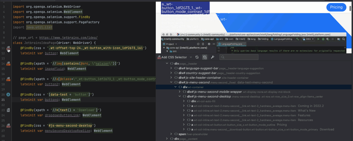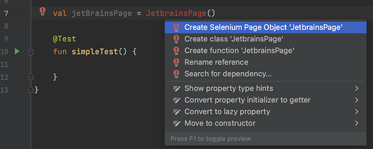 在处理现有页面对象类时如果输入了新的非引用页面对象类,只需导航到警告的上下文菜单并创建新的页面对象即可修正未解决的代码警告。