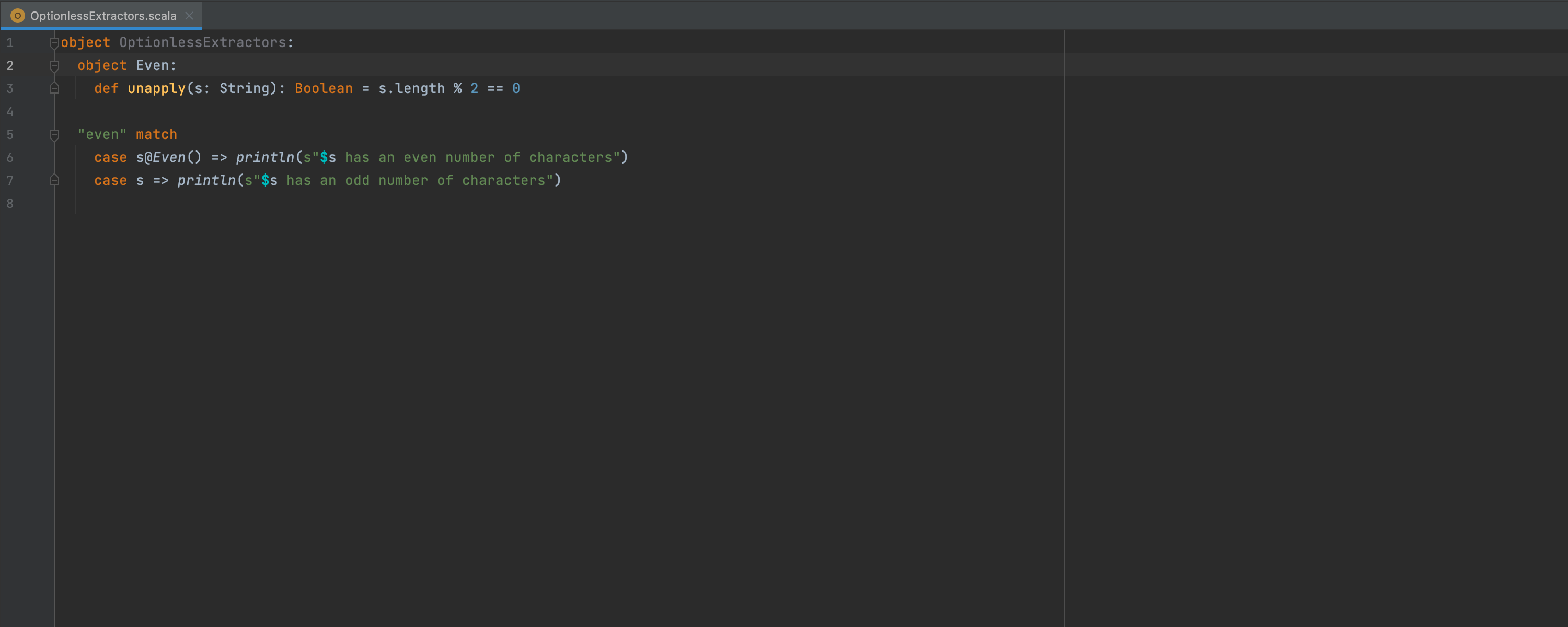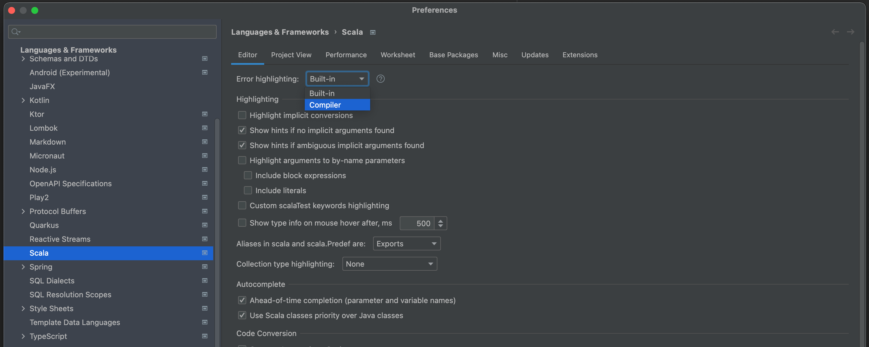从 v2022.2 开始,IntelliJ IDEA 可以从 .tasty 文件读取 match 类型,正确解析类型,解析类型变量,将其用作类型实参,支持检查,以及将类型显示为文本。 除此之外,我们已经增加了对 不带选项的提取器 、 类型 Lambda 和 多态函数类型 、 类型级编译器内部实现 ,以及 ? 和 _ 在 Scala 2.13.9 和 2.12.16 中作为通配符的支持。 复制粘贴的代码现在也可正确缩进。