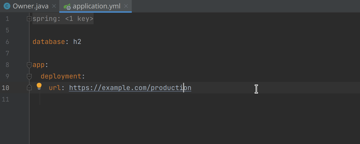 JSON、YAML 和 .properties 文件现在会在以 http:// 和 https:// 开头的值中自动插入 Web 引用。 只需点击一下,即可轻松地在 Web 浏览器中打开这些链接,或者您可以在 HTTP 客户端中通过 Context Actions(上下文操作)菜单 (Alt + Enter) 生成一个请求。