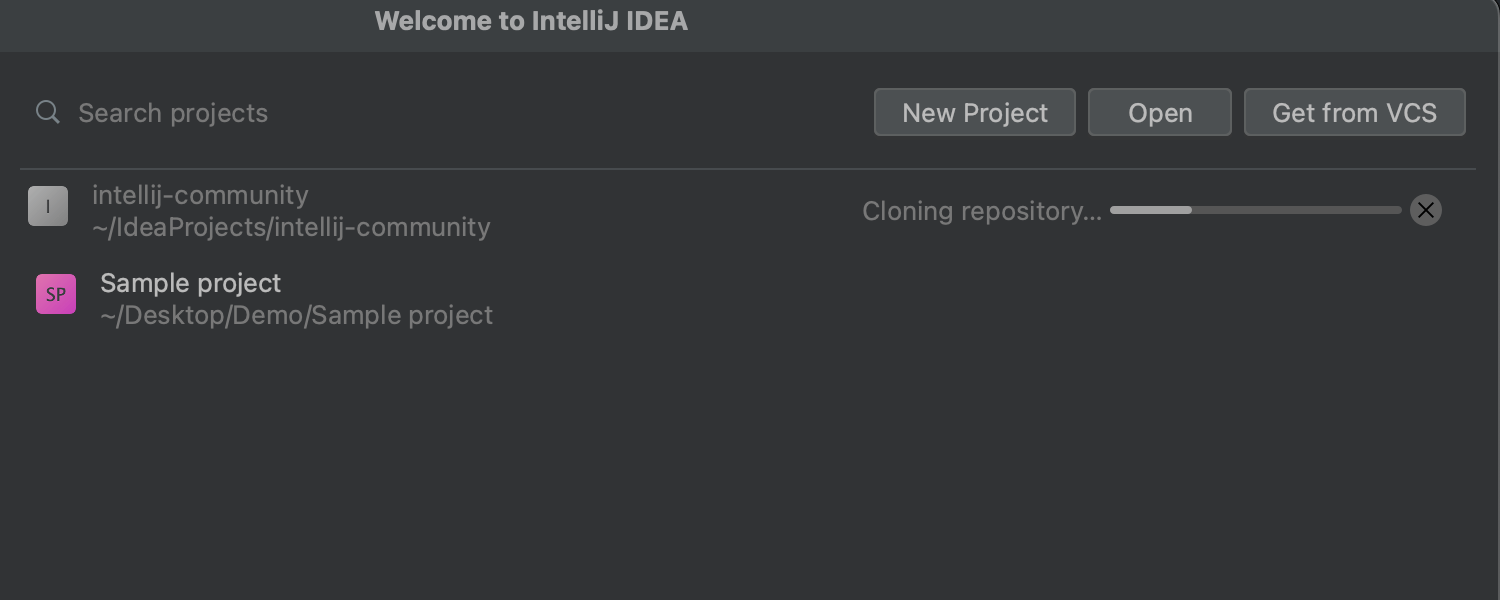 Cloning repository(正在克隆仓库)进度条现在位于 IDE 的欢迎屏幕上,并直接显示在 Projects(项目)列表中,更清晰、更易用。