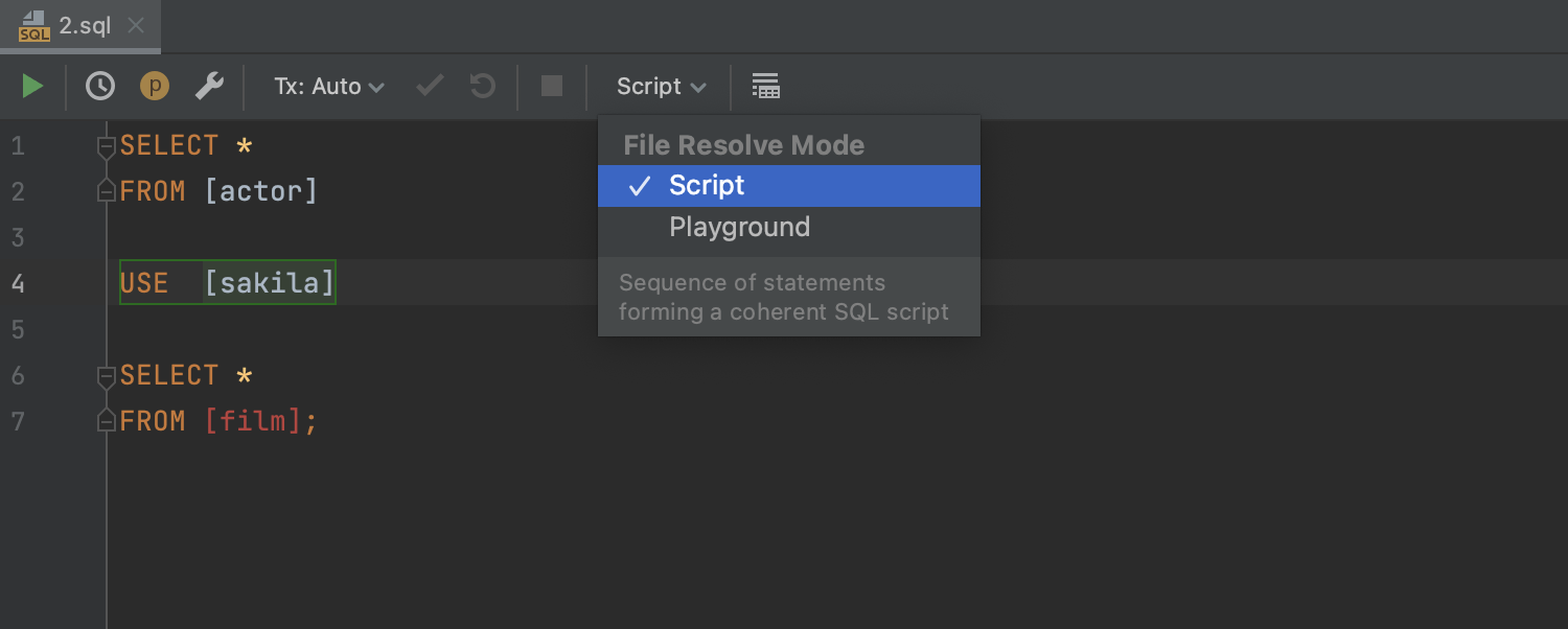 为了使 SQL 脚本中数据库对象的解析更加精确,我们实现了两种解析模式:Playground(演练场)和 Script(脚本)。 如果文件只是一组未连接的查询,彼此独立且没有特定顺序,前者效果更佳。 后者适合查询具有顺序逻辑且应该作为单个脚本运行的情况。