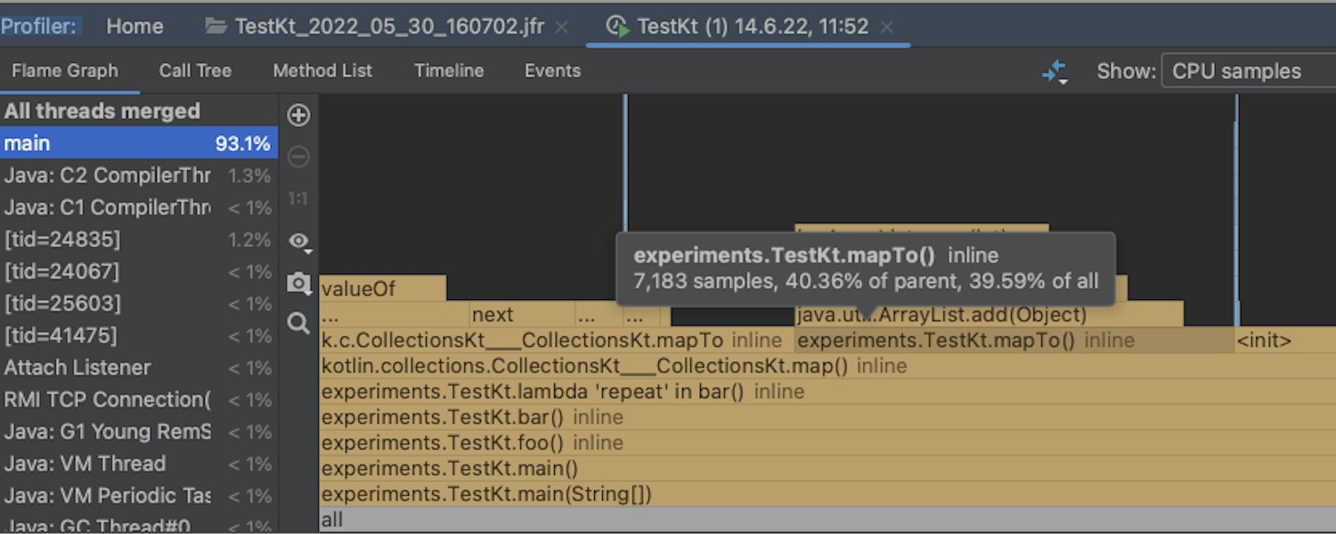 Kotlin 内联函数现在与其他函数一起显示在 Flame Graph(火焰图)、Call Tree(调用树)和 Method List(方法列表)中,这样,您可以查看 CPU 时间并根据需要进行优化。 该功能目前在 Linux 和 macOS 上运行,仅适用于 Start profiling(启动分析)选项。 我们正在努力添加对 Windows 的支持,也将很快把它添加到 Attach 模式。