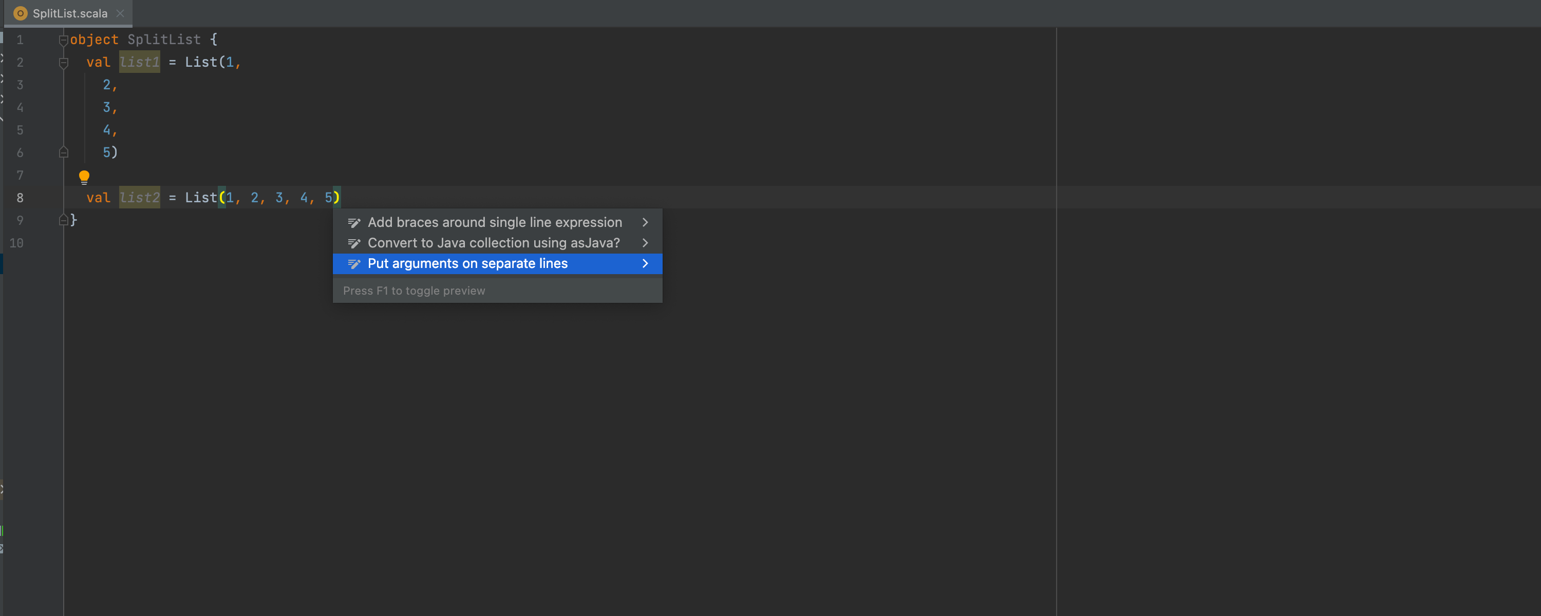如果代码行因包含集合中的实参或元素列表而过长,您可以使用弹出菜单中的 Put arguments on separate lines(将实参放在单独的行中)操作快速将列表拆分为多个行。 同样,如果您认为多行列表较短,可以使用 Put arguments on one line(将实参放在同一行中)操作将其合为一行。
