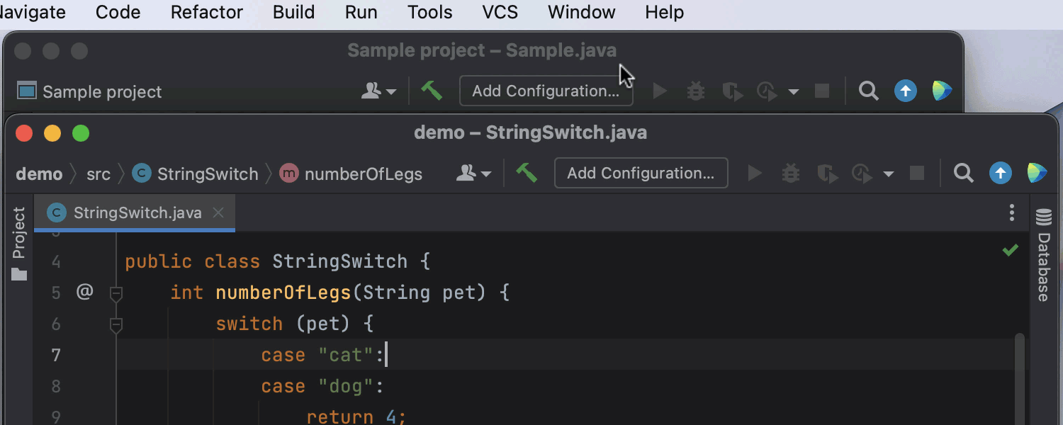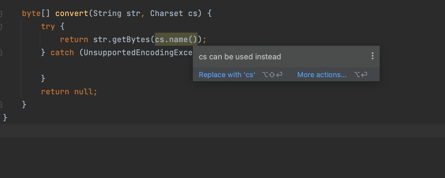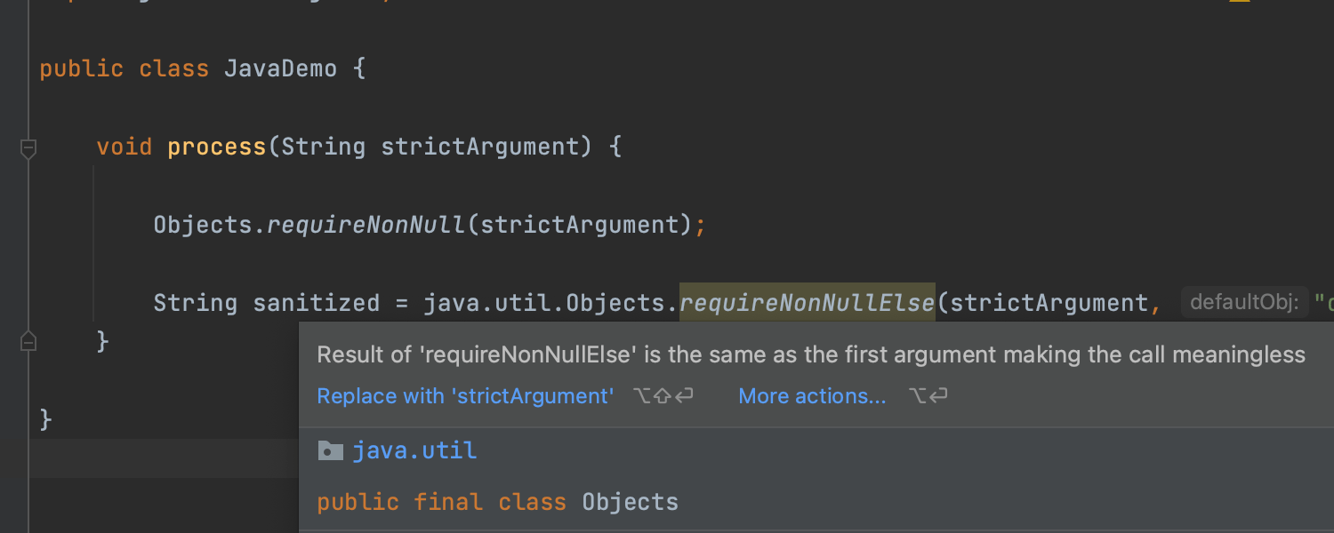 我们对 Java 检查实现了一系列更改,这些更改有助于跟踪潜在错误和简化代码。 例如, Standard ‘Charset’ object can be used(可以使用标准 'Charset' 对象)检查已得到改进,现在可以识别 .name() 和 .toString()。 IDE 现在可以在模式变量隐藏字段时发出警告,还会捕获无意义的 Objects.requireNonNullElse 调用。 大量 JUnit 相关 Java 检查已转换为 JVM 检查,因此,它们现在也可以在 Kotlin 中使用。 此外,代码补全现在会在适用时建议 .class 字面量。