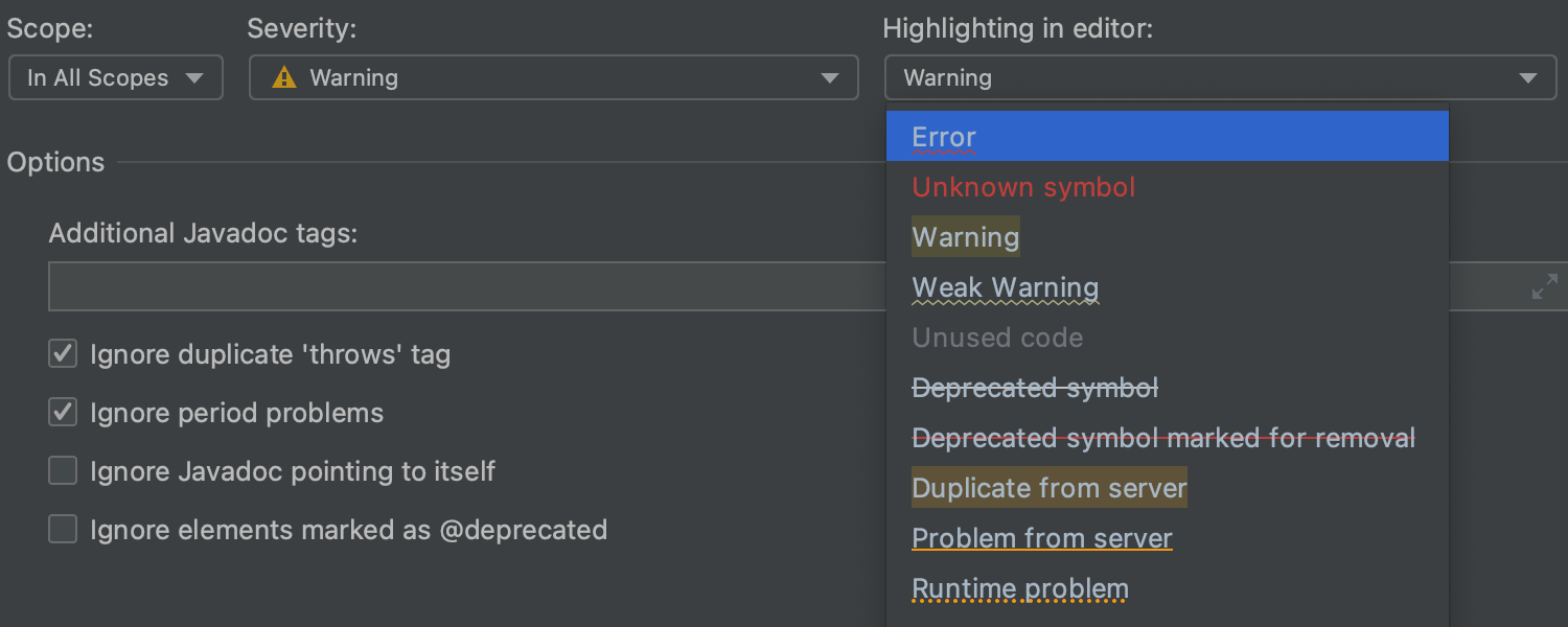 现在,无需更改严重性级别即可配置检查在编辑器中的显示方式。 如需更改检查高亮显示样式,可以使用新的 Highlighting in editor(编辑器中的高亮显示)下拉菜单进行设置,该菜单清楚显示了所有可用选项。