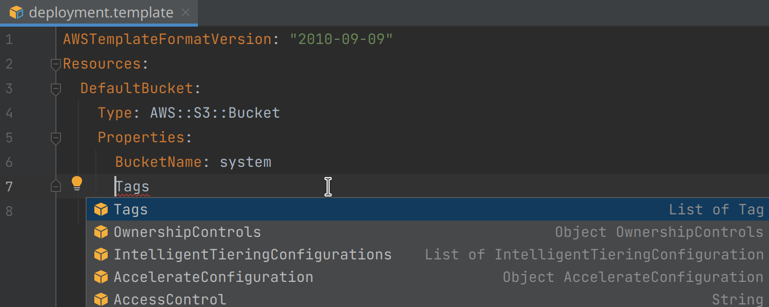 我们通过更新元数据架构和改进属性补全重做了 AWS CloudFormation 插件。 您可以从 JetBrains Marketplace 安装插件的更新版本。