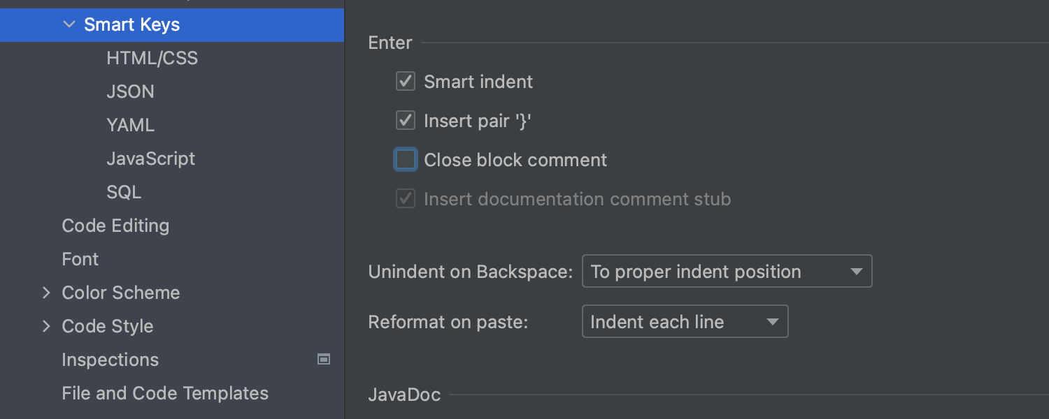 现在,可以在按 Enter 键后禁用自动块注释结束。 为此,请转到 Settings / Preferences | Editor | Smart Keys(设置/偏好设置 | 编辑器 | 智能按键),取消选中 Enter 版块中的 Close block comment(结束块注释)复选框。