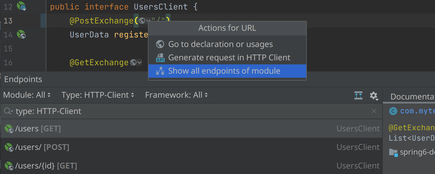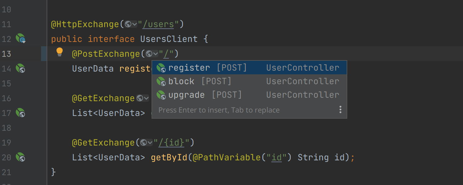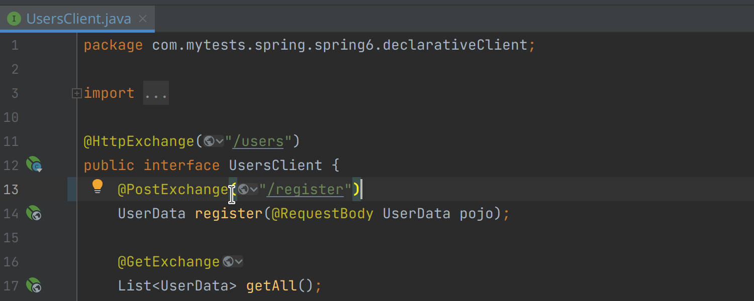 借助 Spring Framework 6,您可以将 HTTP 客户端定义为带有注解方法的 Java 接口。 IntelliJ IDEA 2022.2 为此类接口提供了 URL 补全、导航以及与 HTTP 客户端的集成。